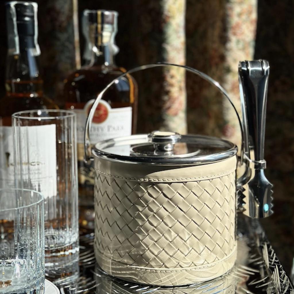 Stainless steel ice bucket covered with handwoven leather.