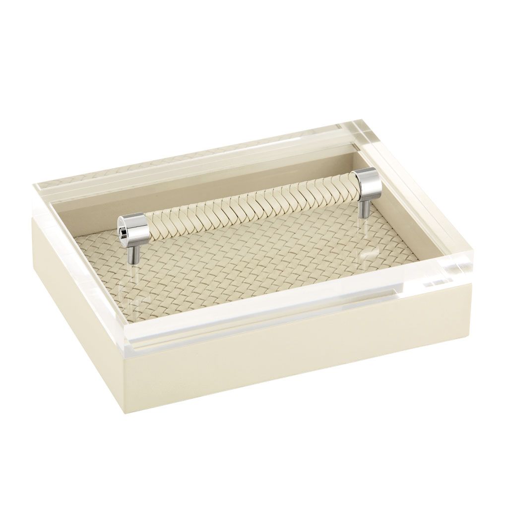 Leather box with acrylic lid, padded handwoven lining, woven leather handle.