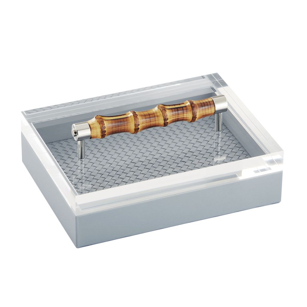 Leather box with acrylic lid, padded handwoven lining, bamboo handle.