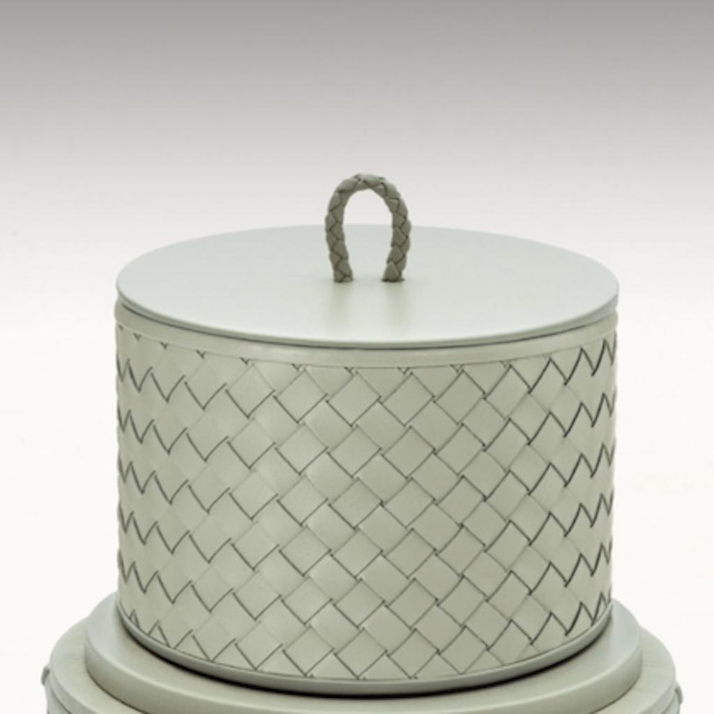 Round leather box with lid, handwoven finish.