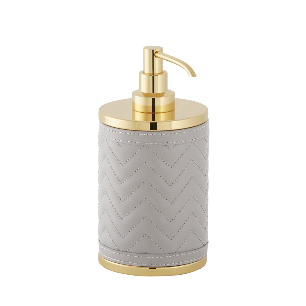 Soap dispender covered with quilted herringbone padded leather and boasts a chrome or gold metal finish.