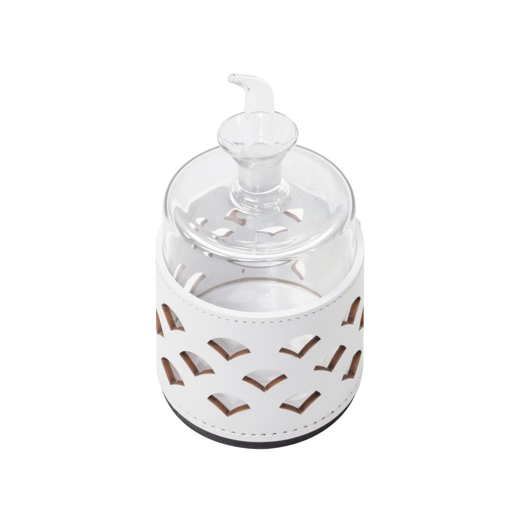 Transparent borosilicate glass partially dressed in finest regenerated leather with water-resistant and UV-resistant finish.