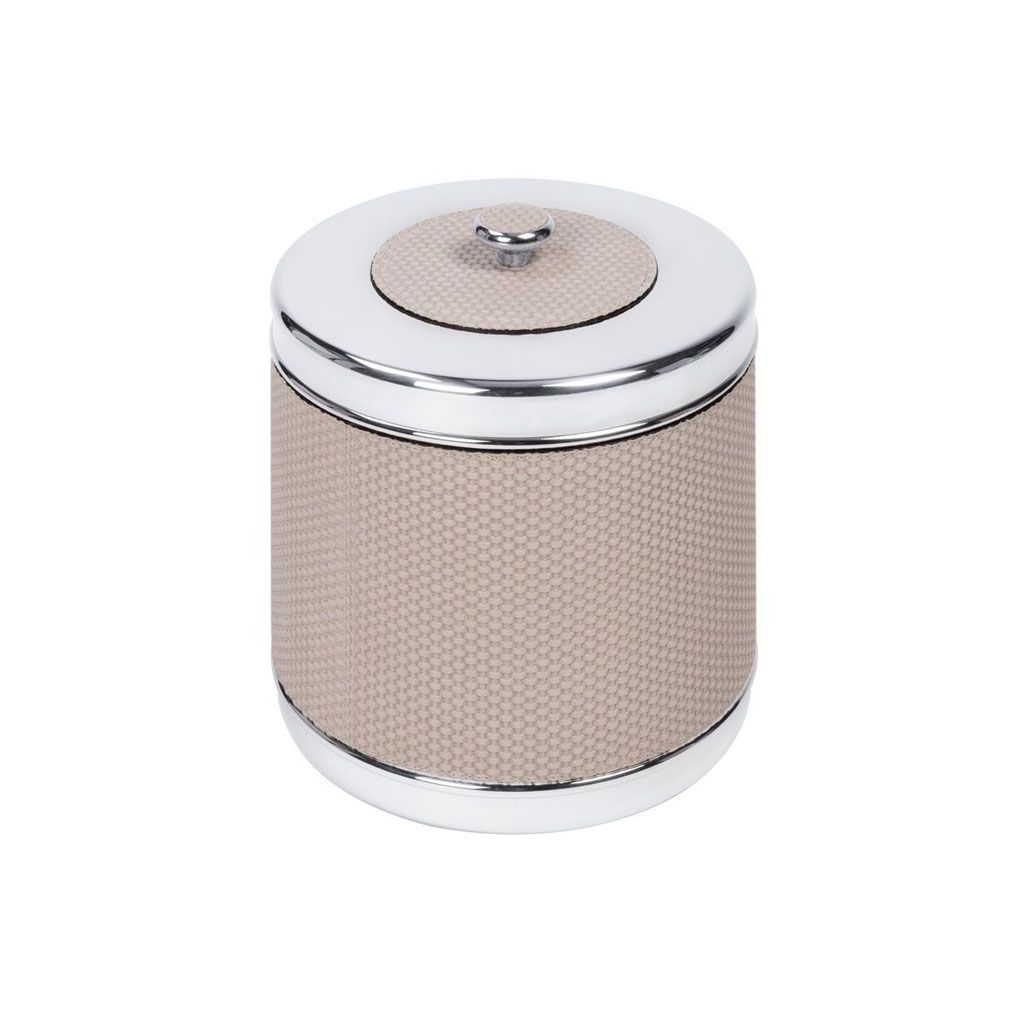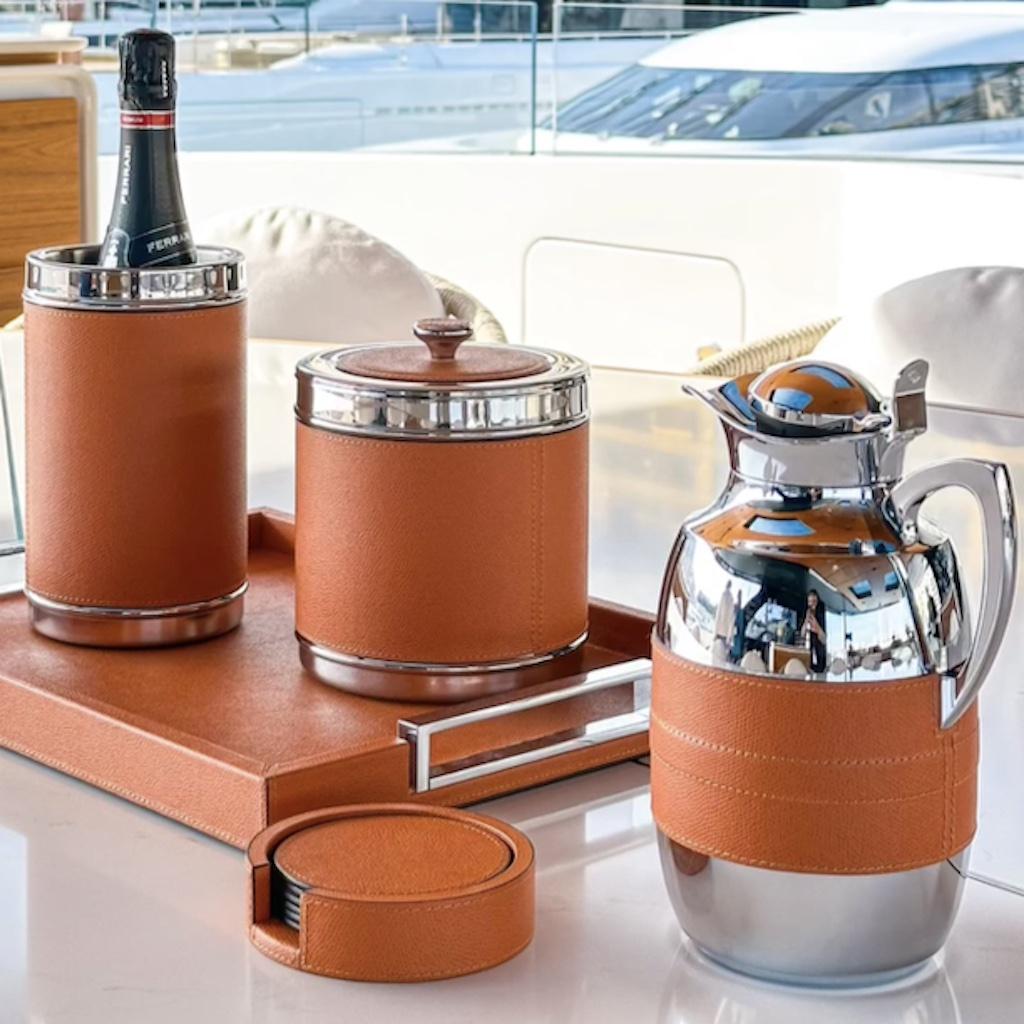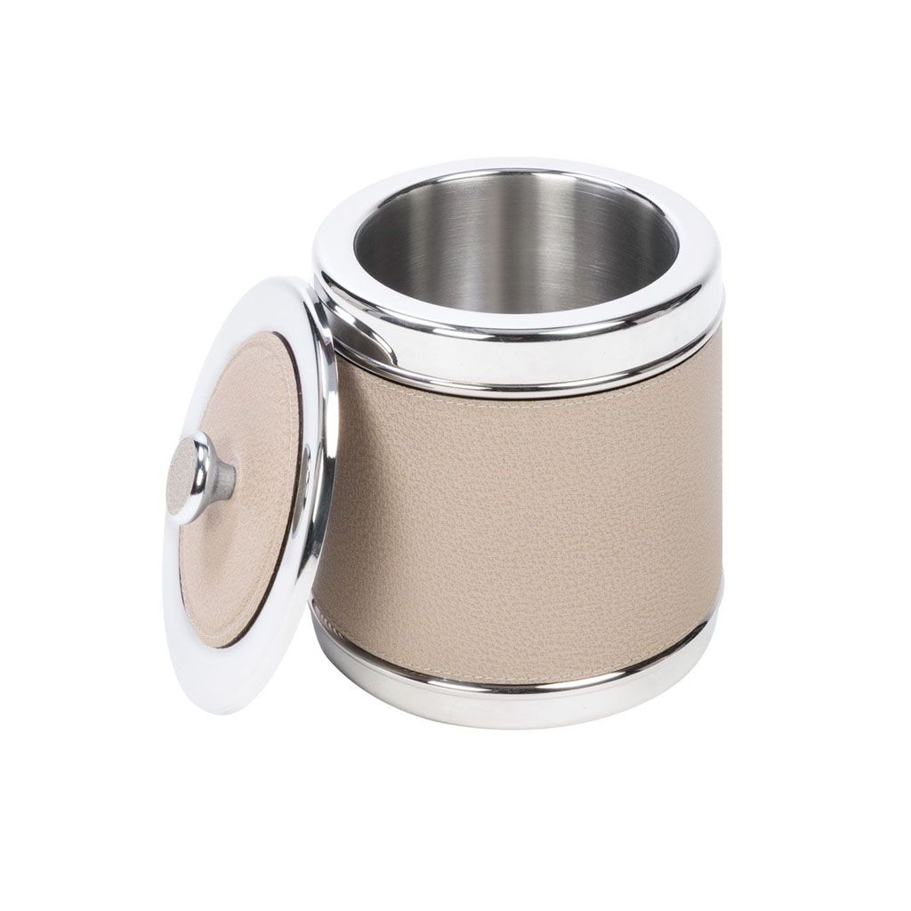 Insulated ice bucket with lid in chrome-plated steel and leather.