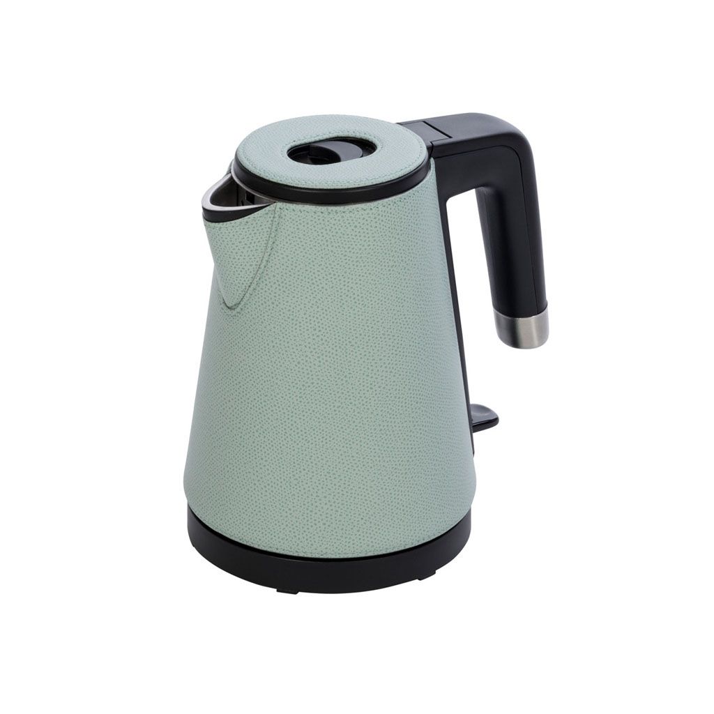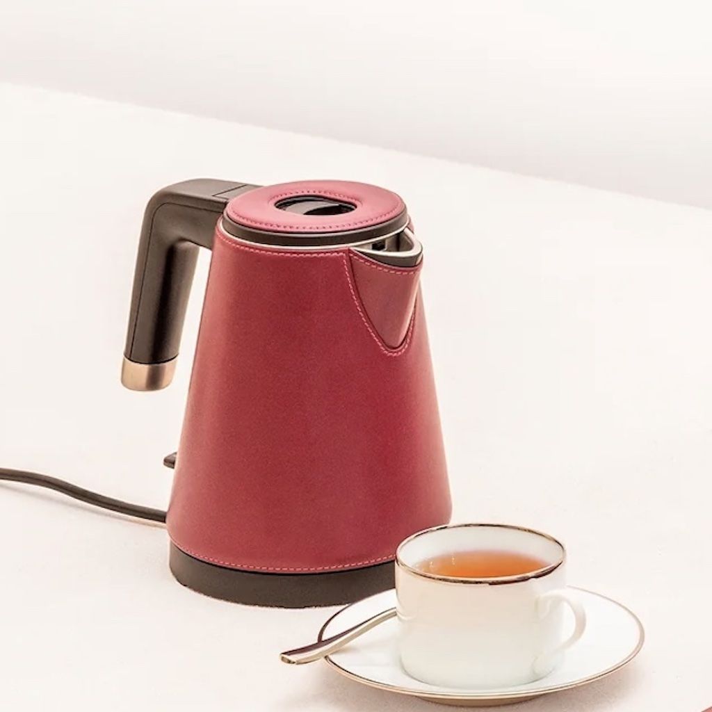 Leather bound insulated stainless steel kettle that features a pour trough stopper and removable head.