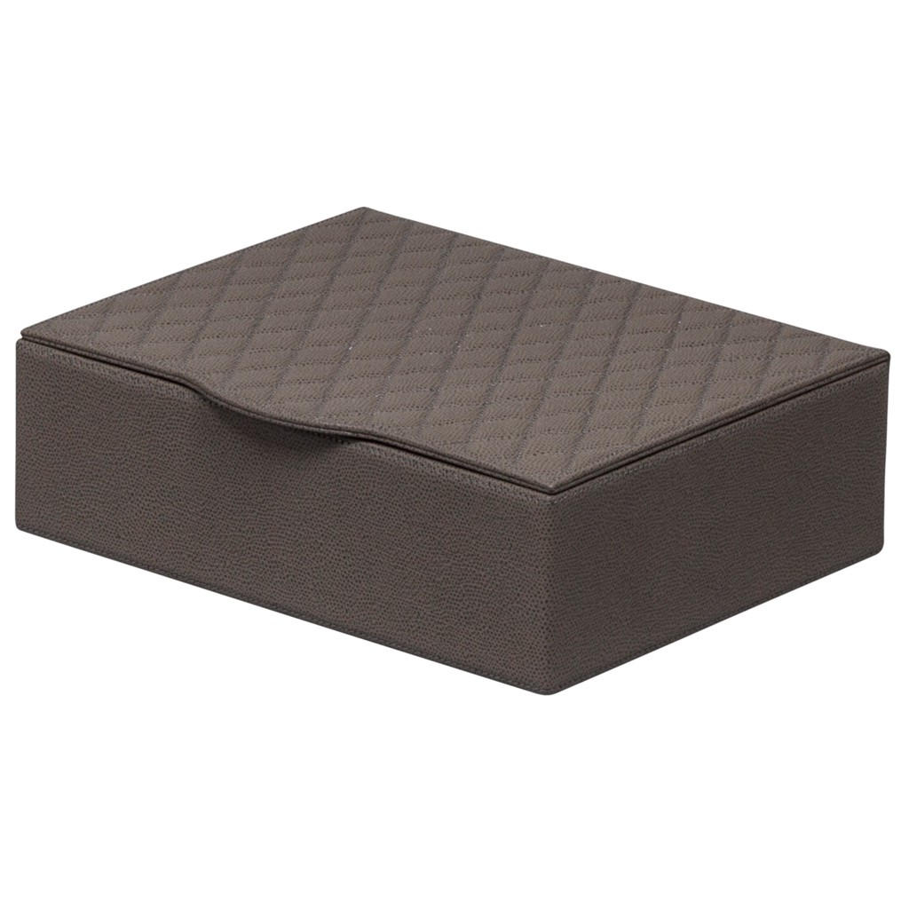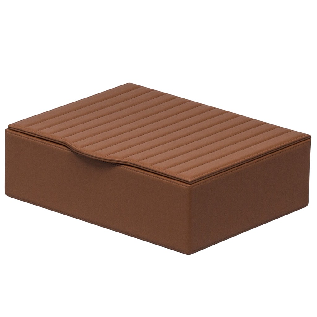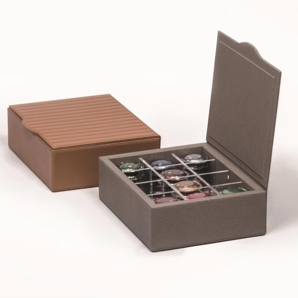 Leather covered wood structure with hinged lid. Comes with a plexiglass panel able to host 30 Nespresso capsules.