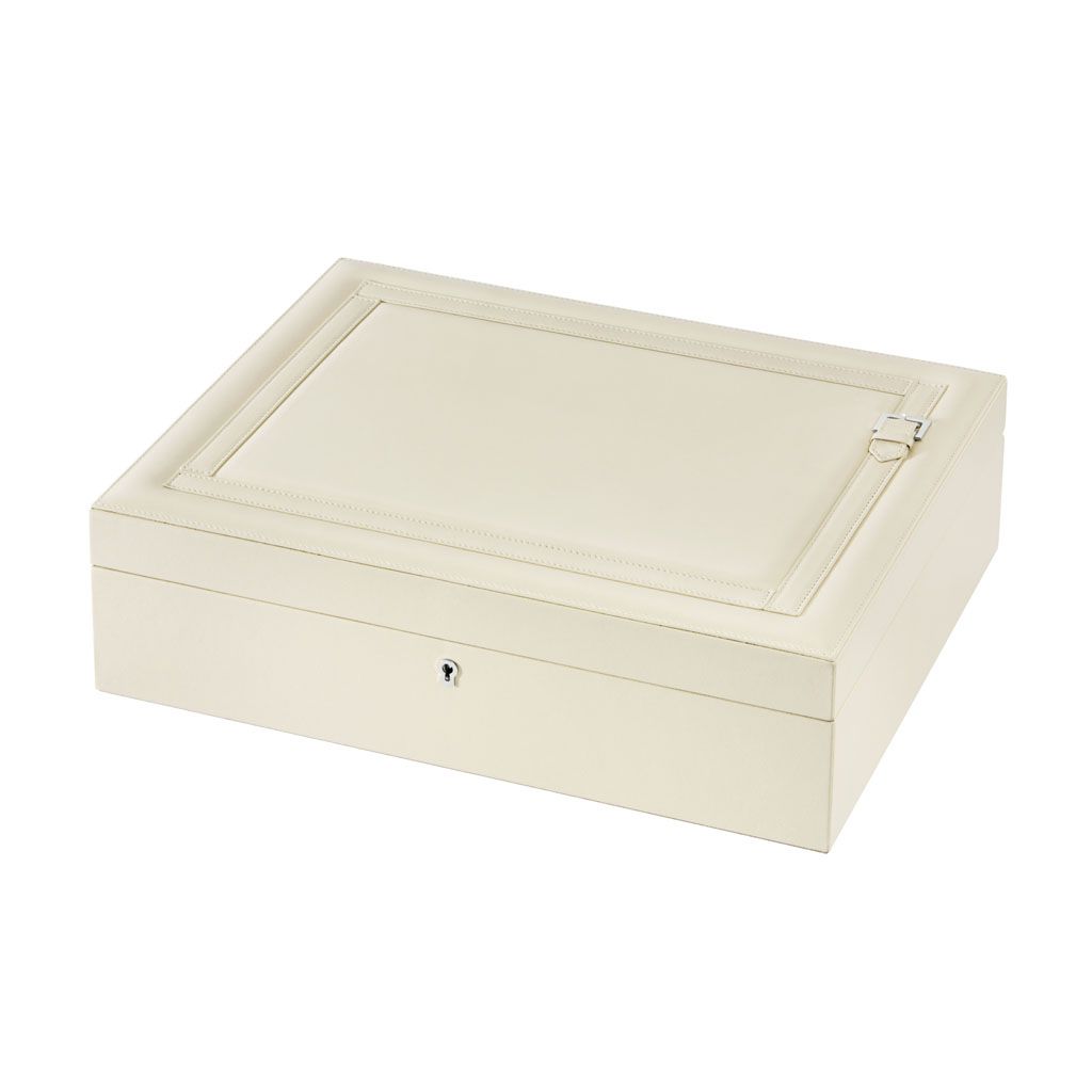 Leather jewellery box with ‘belt ‘ decoration, double removable tray, suede lining.