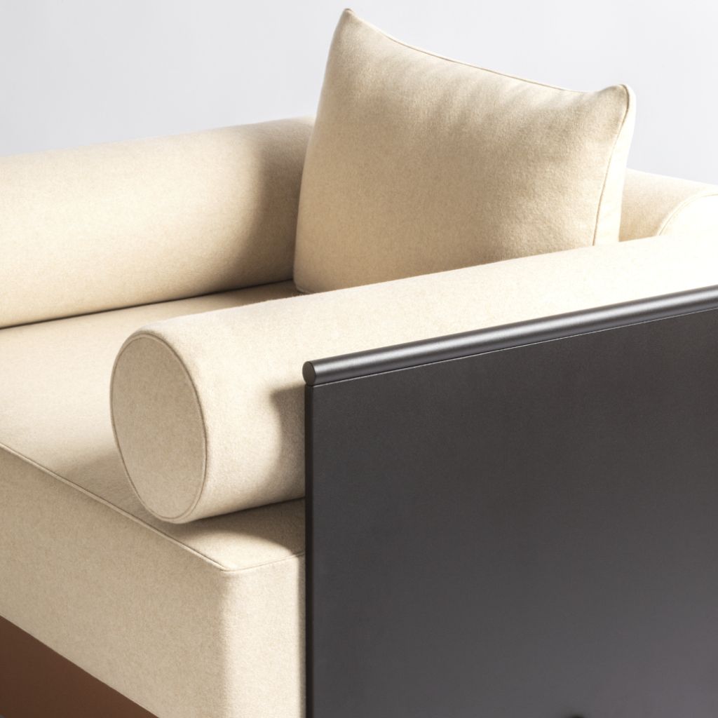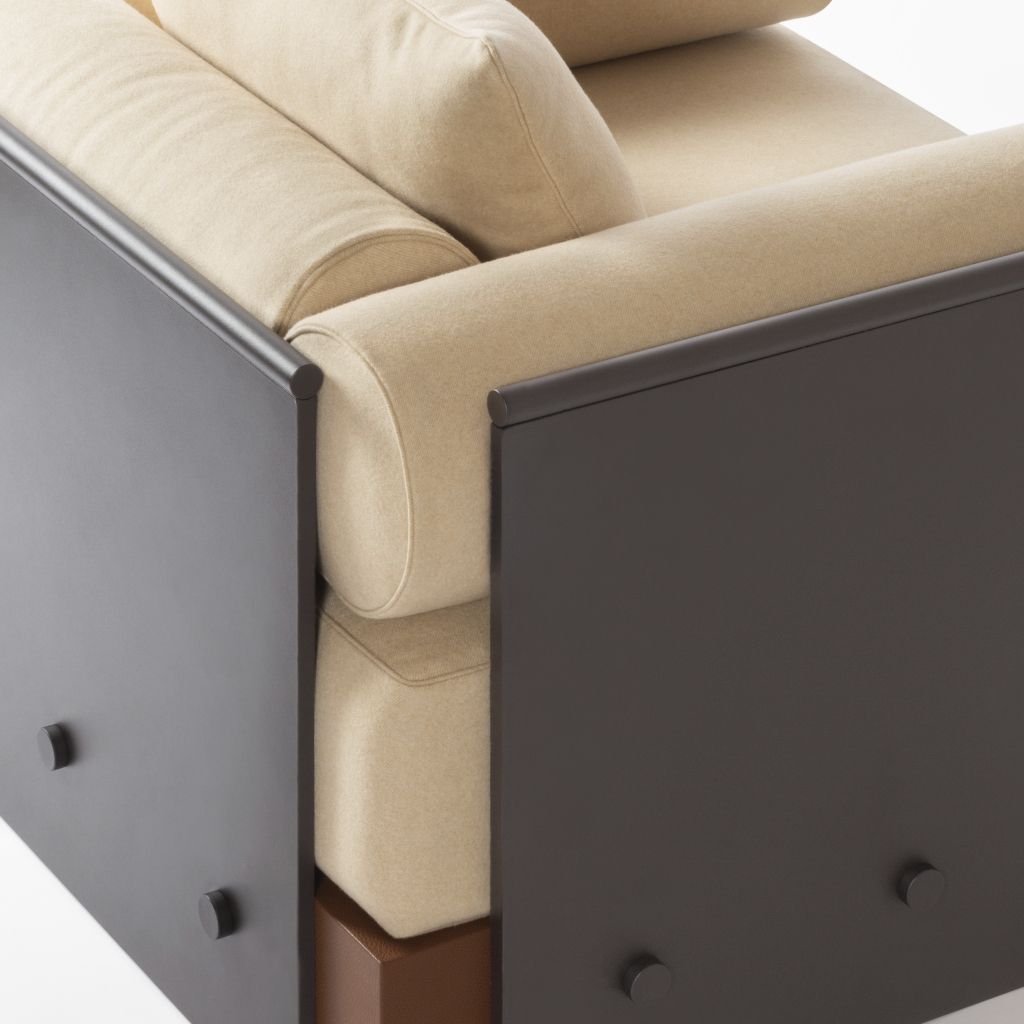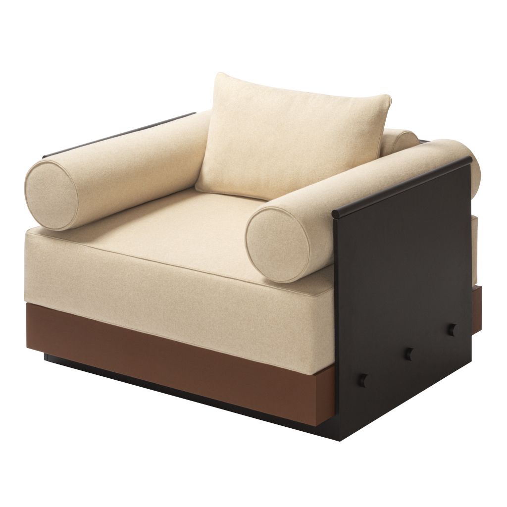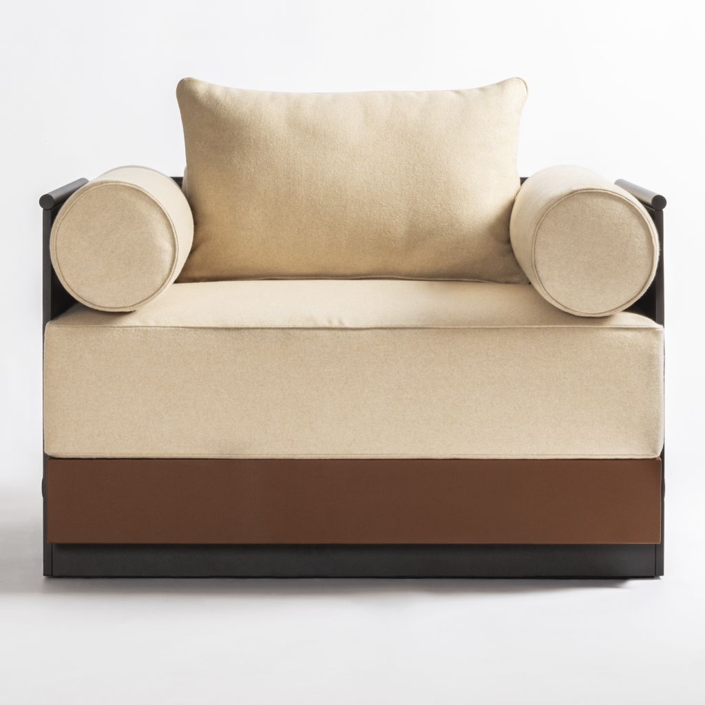 Wrapped by the frame, a fine leather base exudes luxury, while the seat and cushions, dressed in precious fabric, promise comfort beyond compare.