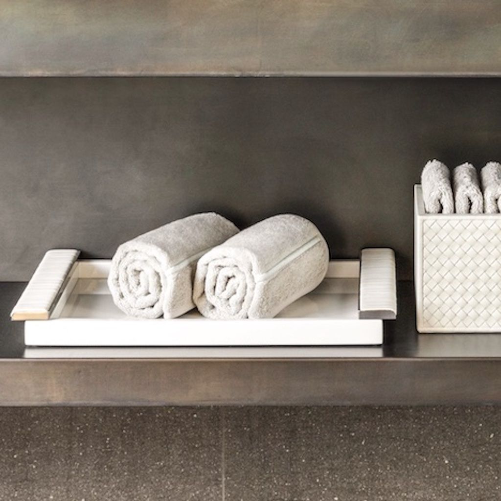 Lacquered tray with leather wrapped handles, chrome or gold details.