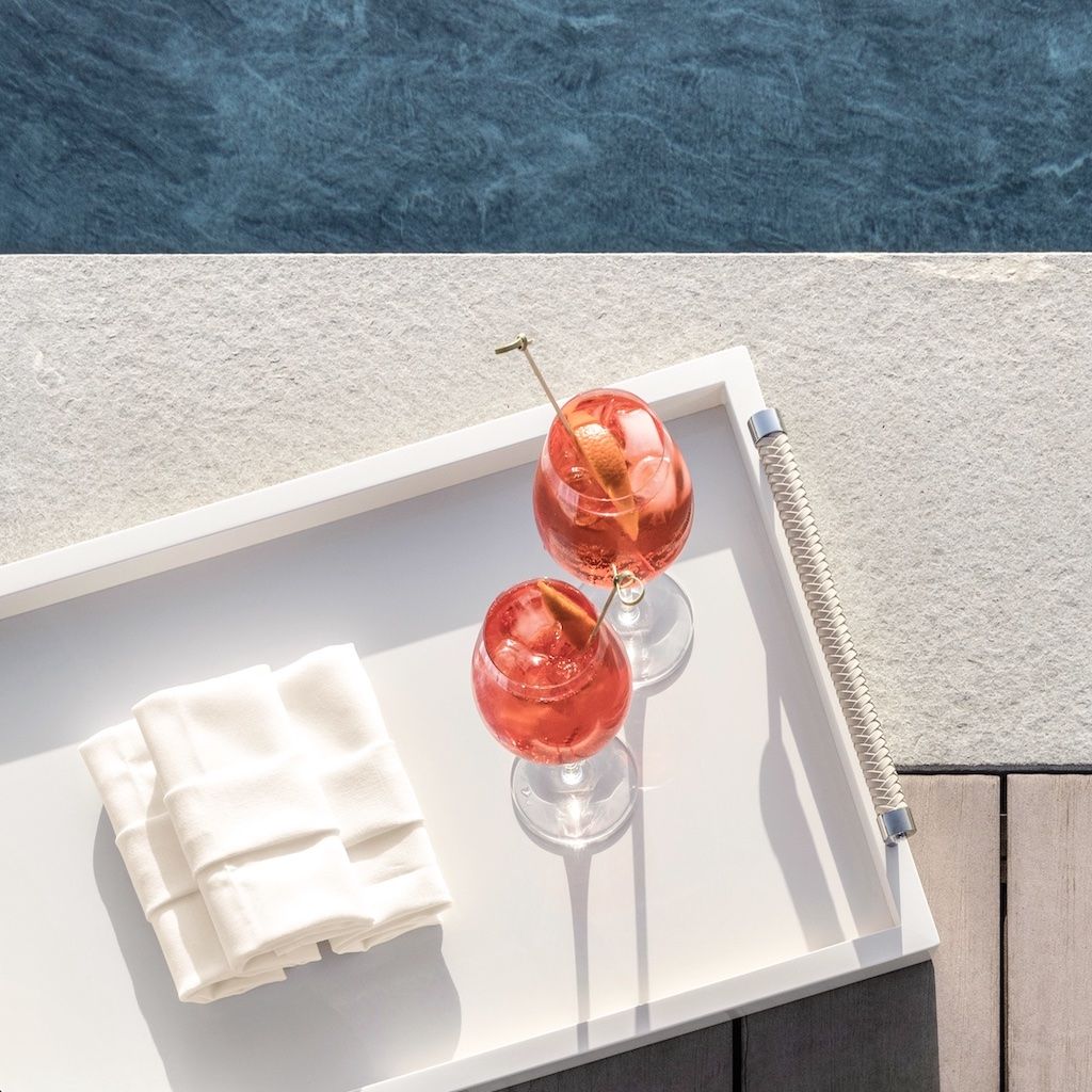 Lacquered tray with handwoven leather handles.