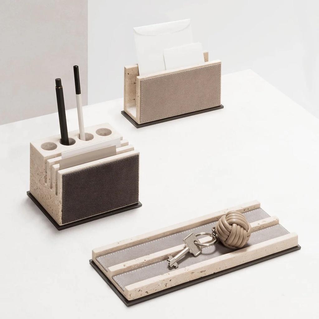 Travertine marble structure with leather inserts and brass frame available in different finishes.