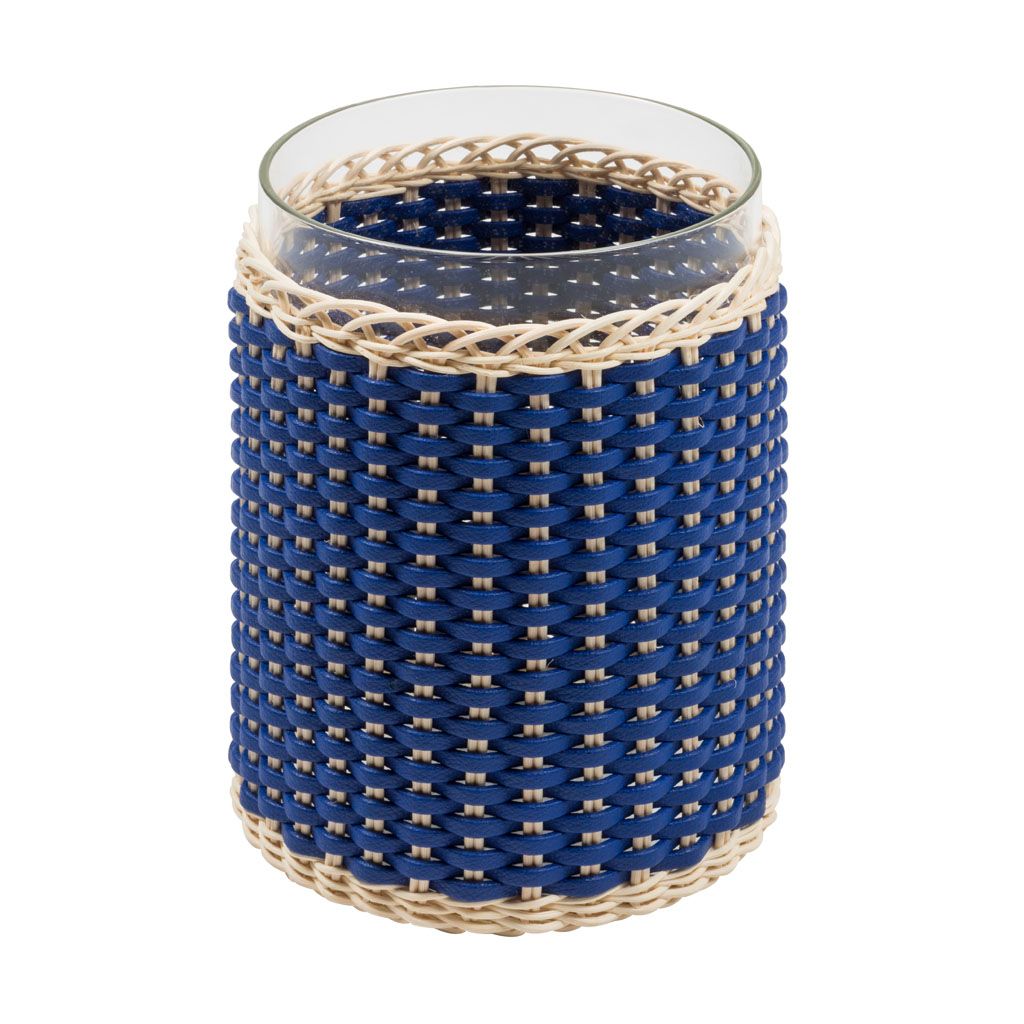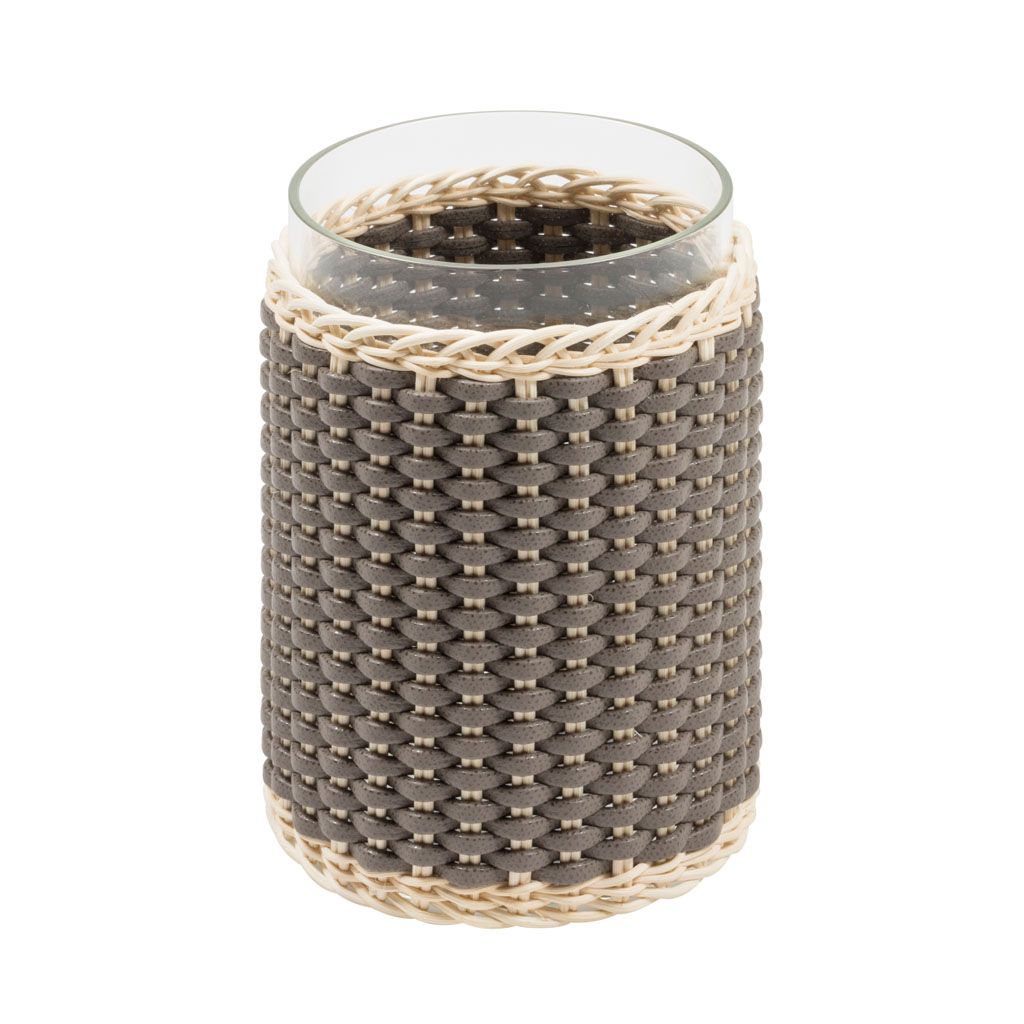 Candle holder made in borosilicate glass and partially covered in woven leather and rattan.