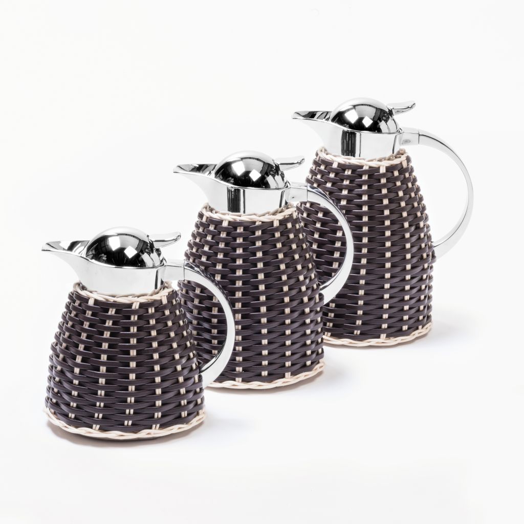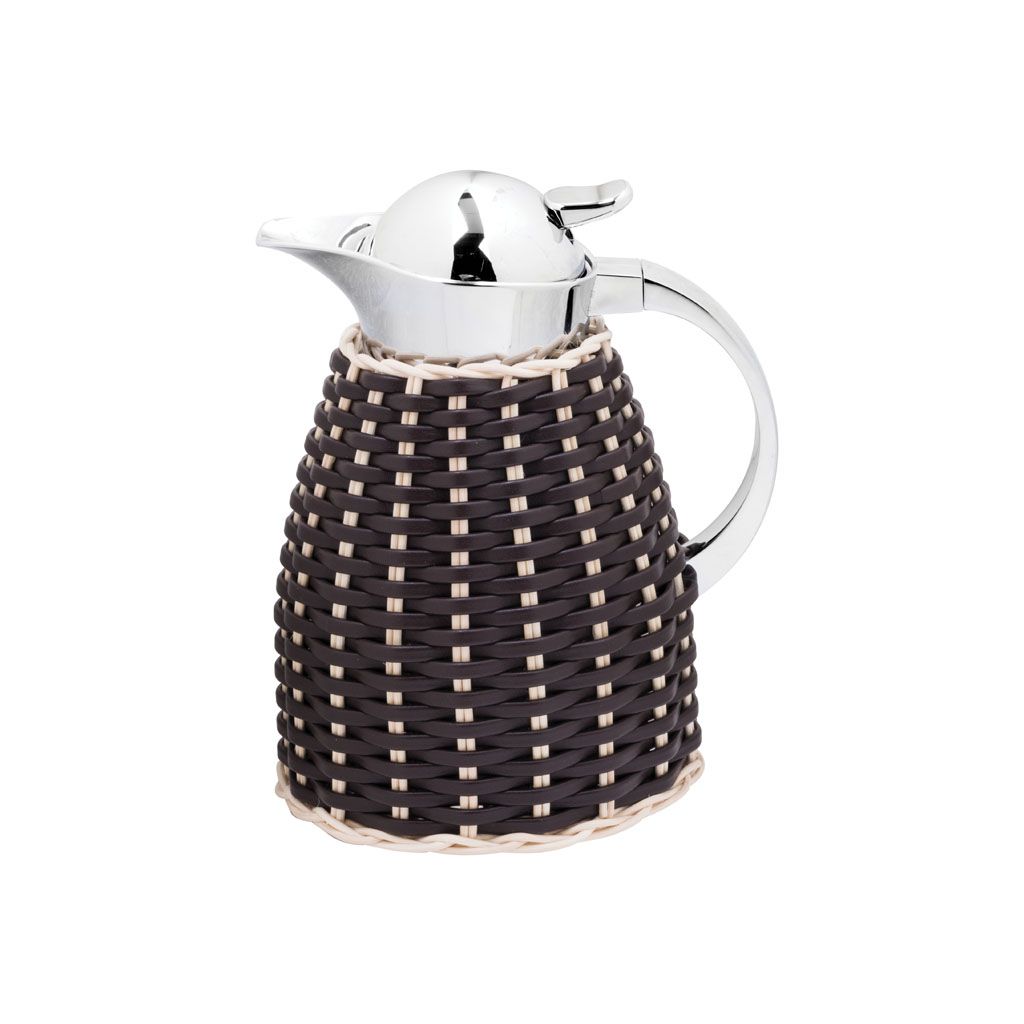 Partially leather and rattan covered insulated brass carafes with chrome plated finish.