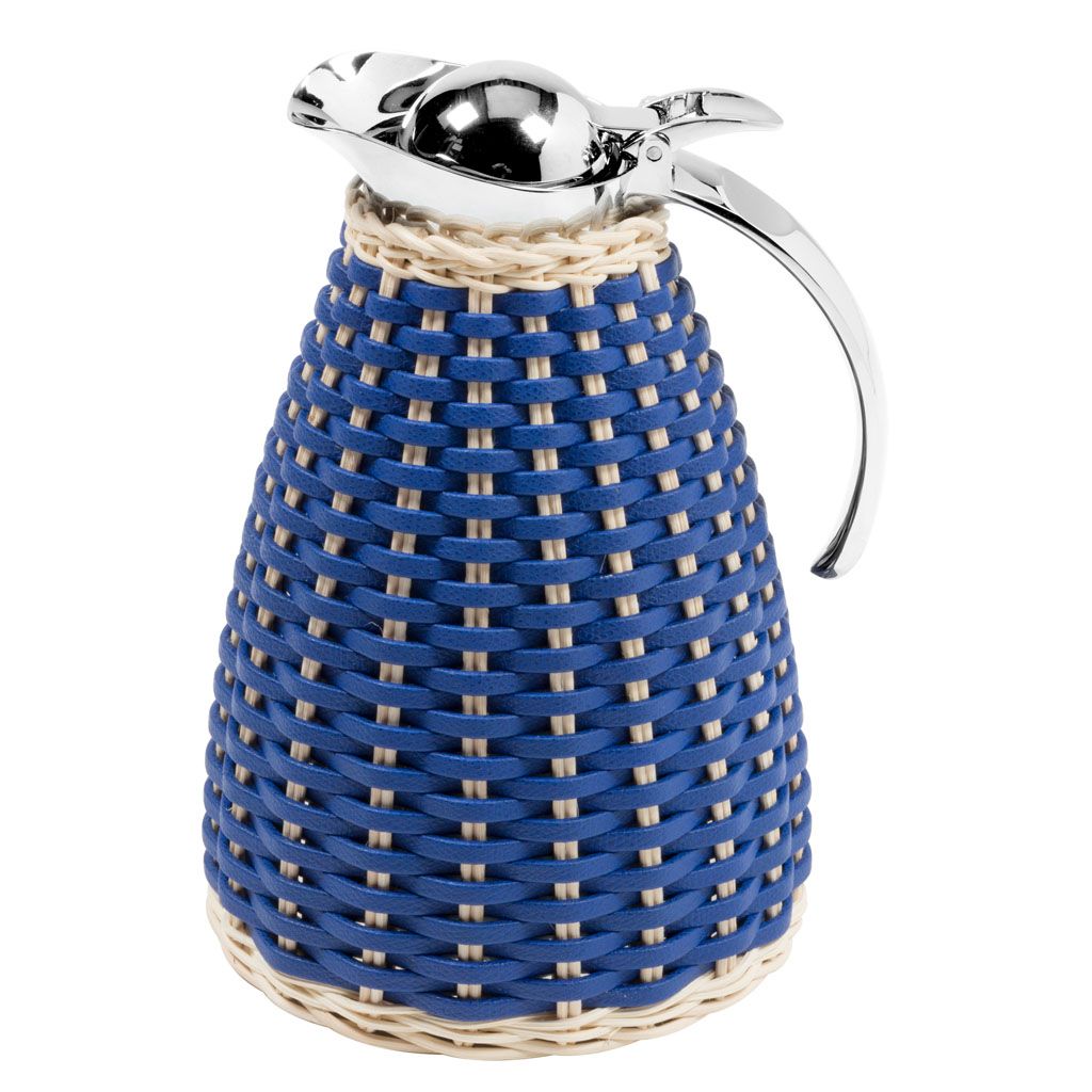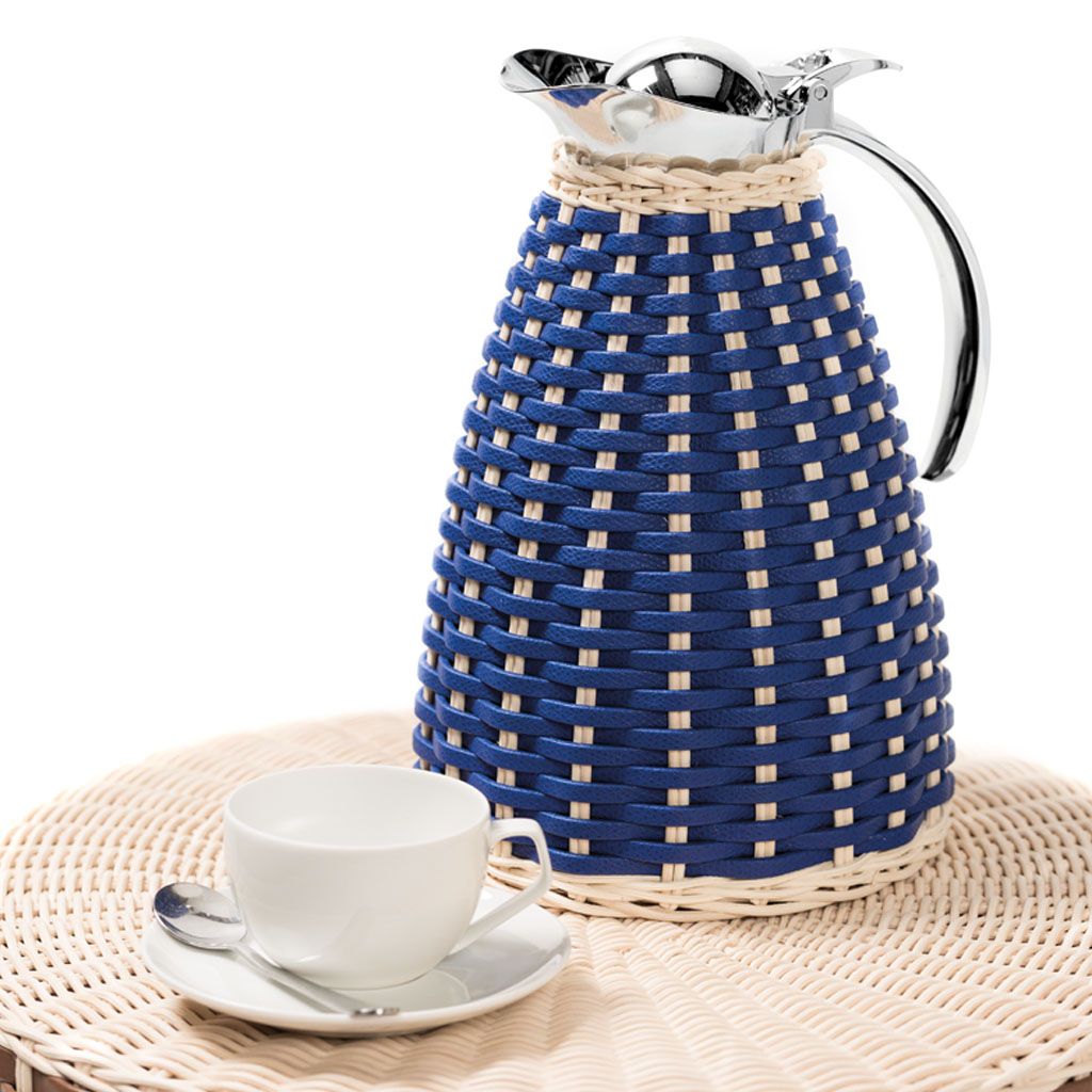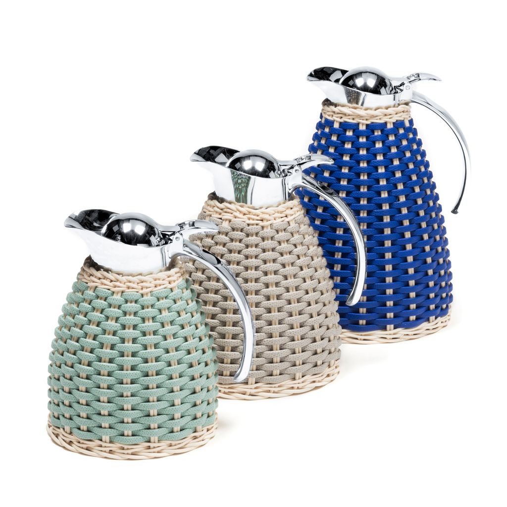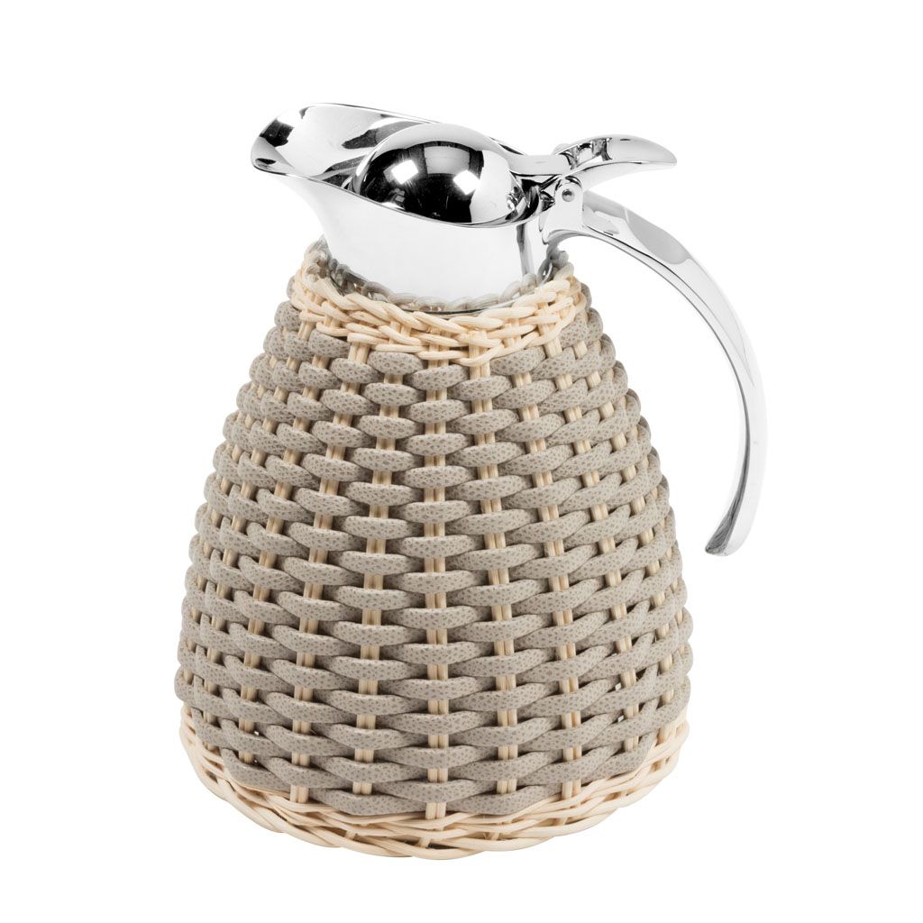 Insulated stainless steel carafes partially covered in woven leather and rattan with chrome plated finish.