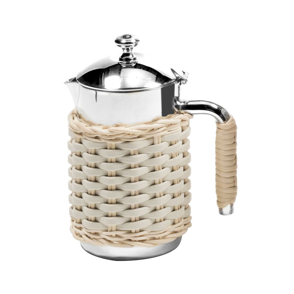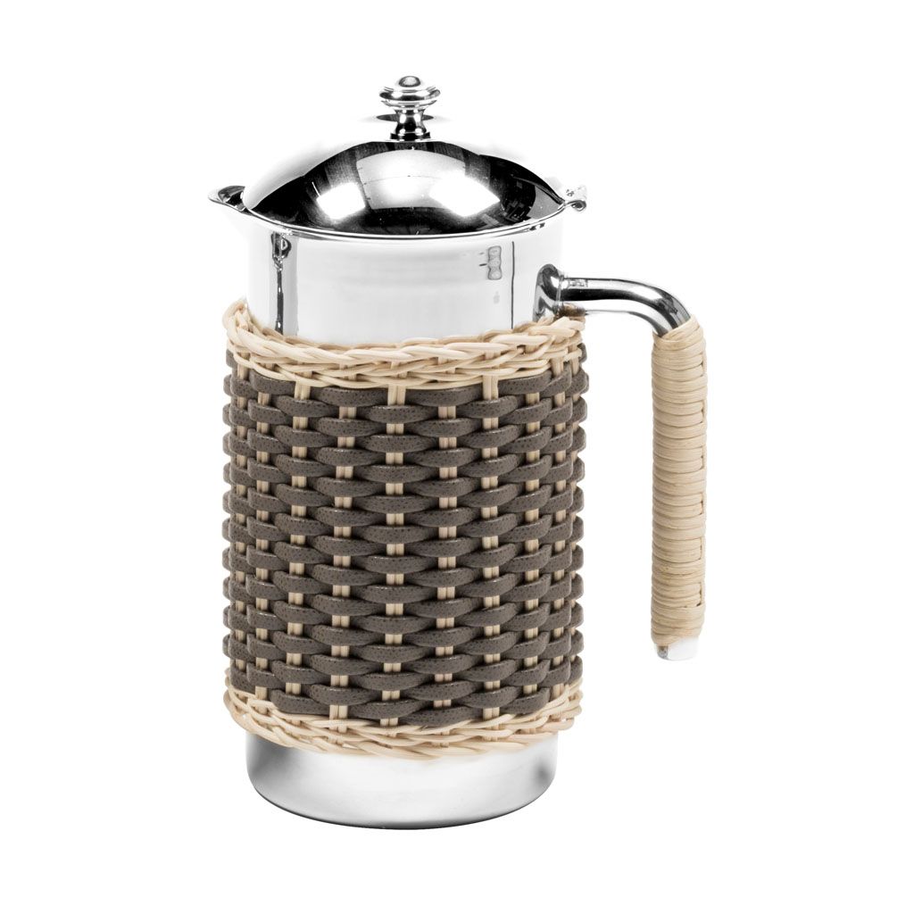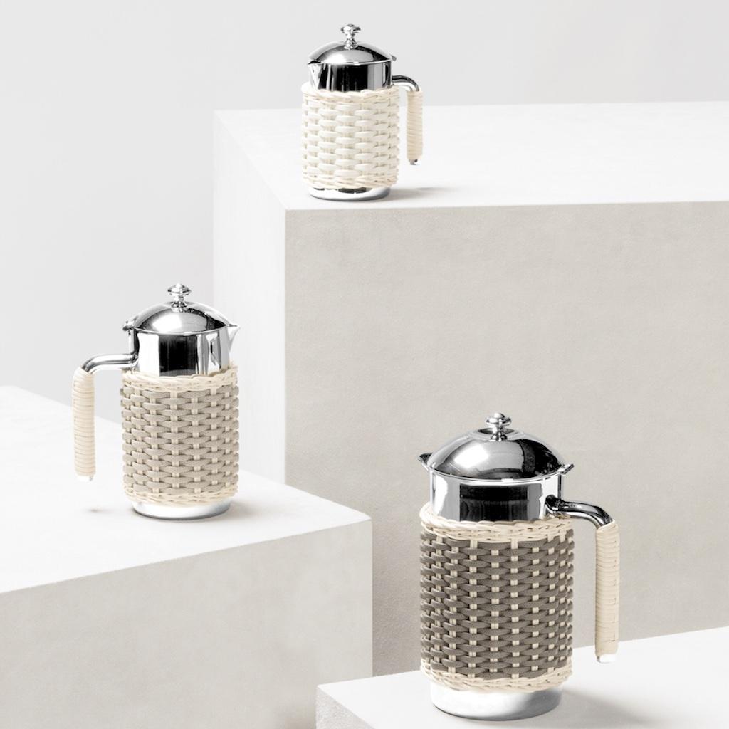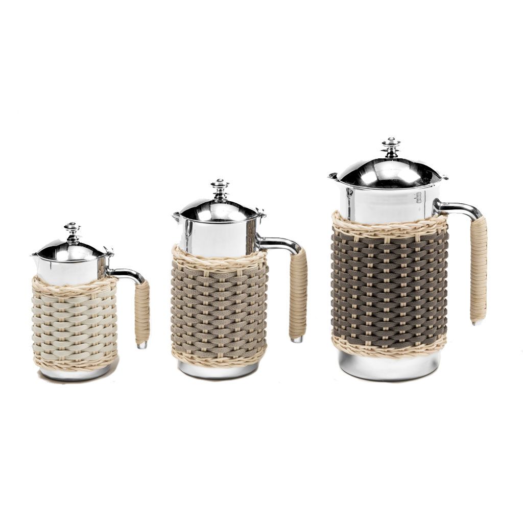 Insulated stainless steel carafes partially covered in woven leather and rattan with chrome plated finish.