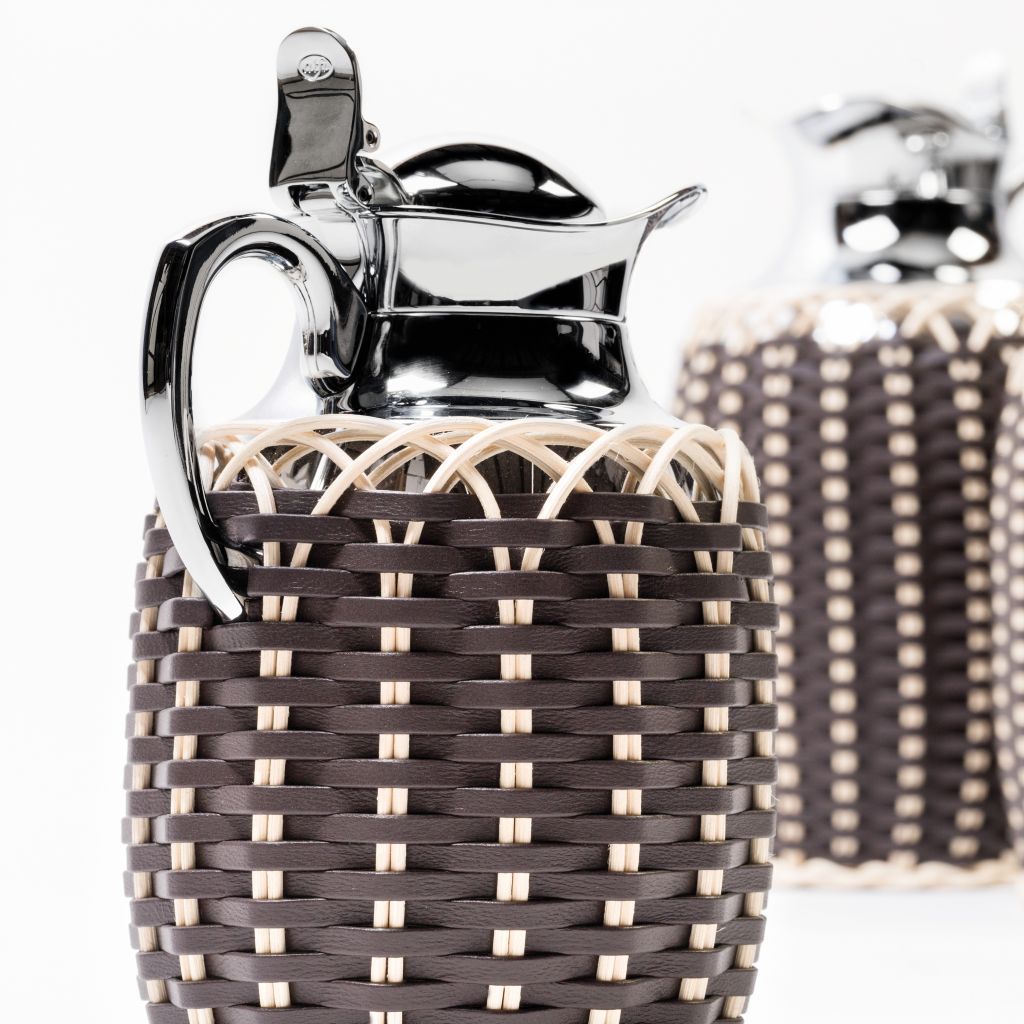 Insulated brass carafe partially covered in woven leather and rattan with a chrome plated finish.
