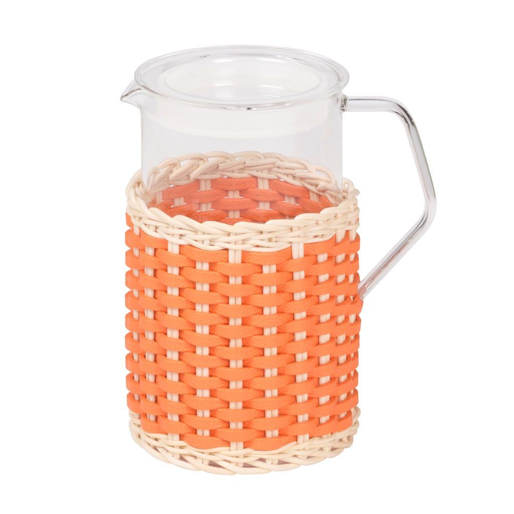 Transparent borosilicate glass pitcher partially covered in woven leather and rattan.