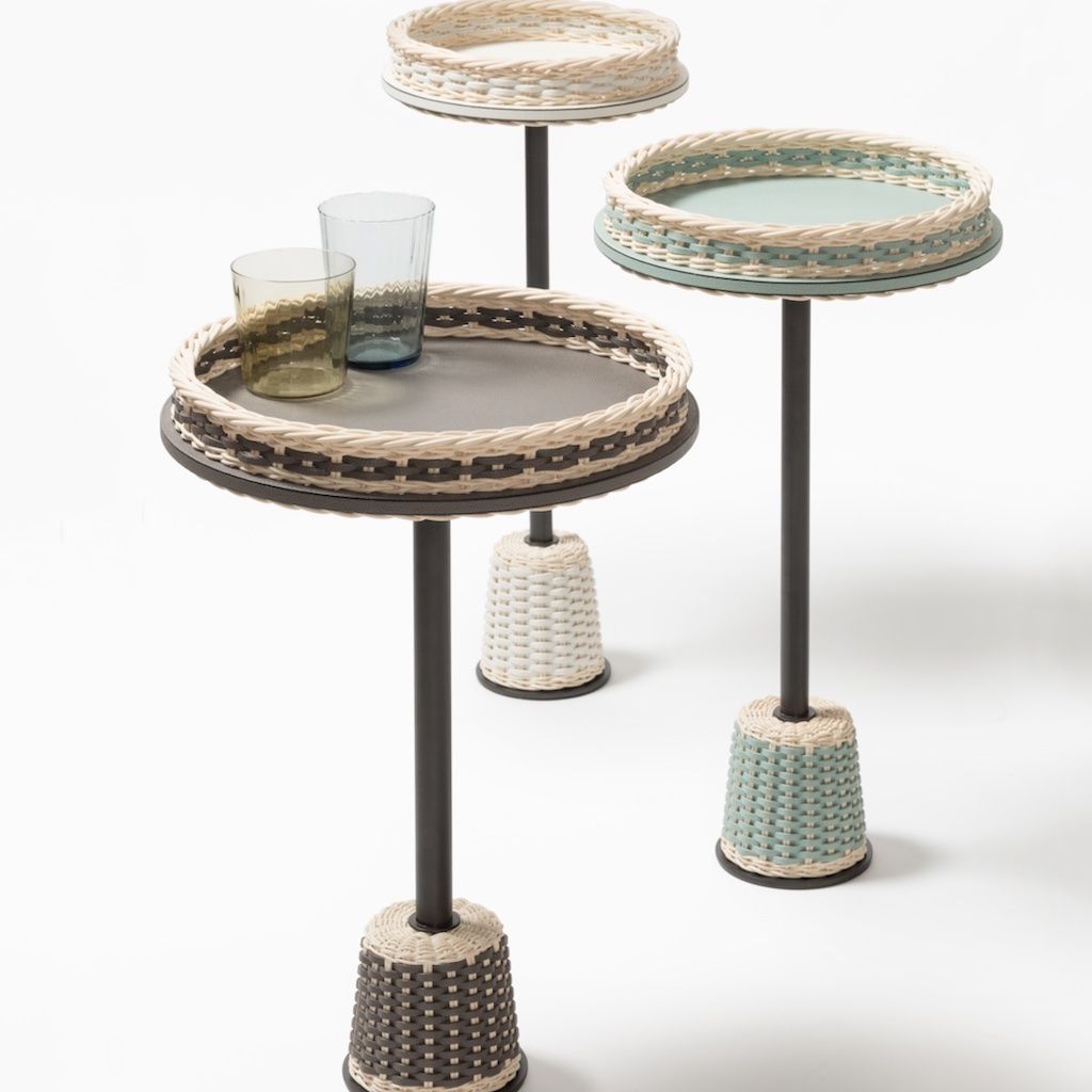 Metal structure available in different finishes boasting a top and base made with woven leather and rattan.