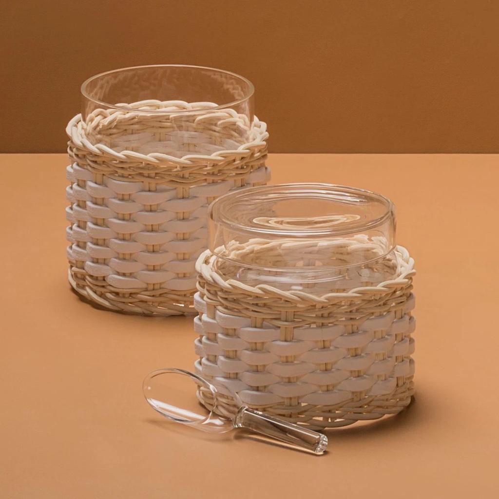 Transparent borosilicate glass bowl partially covered in woven leather and rattan.