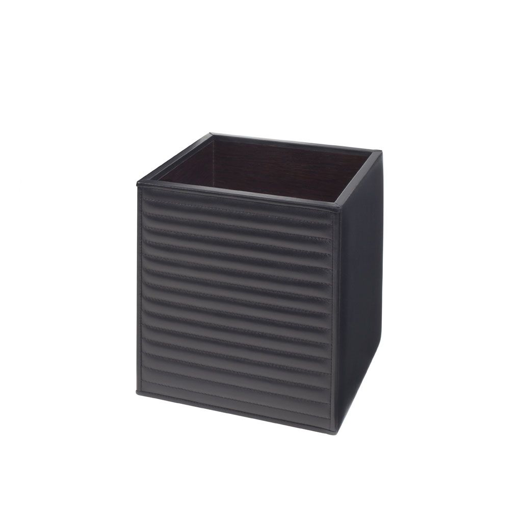 Waste basket, quilted striped leather on two sides, lining in varnished wood.