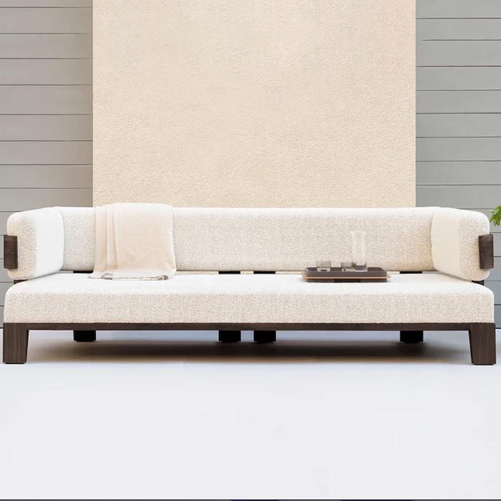 Materials: upholstered cushions dressed with custom fabric, base in Canaletto walnut wood.