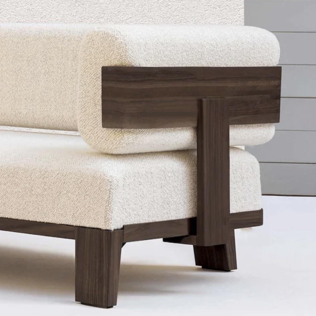 Featuring clean lines and elegantly studied details, shapes naturally blend together to create unique, iconic pieces, while the rigidity of wood meets the soft comfort of the upholstered cushions,
