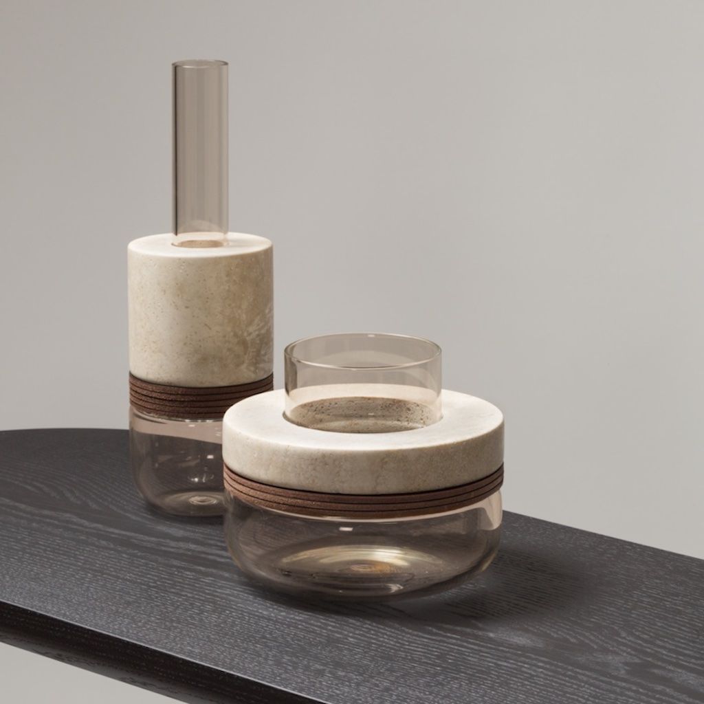 Blown amber colored glass and structure with saddle leather and travertine marble inserts.