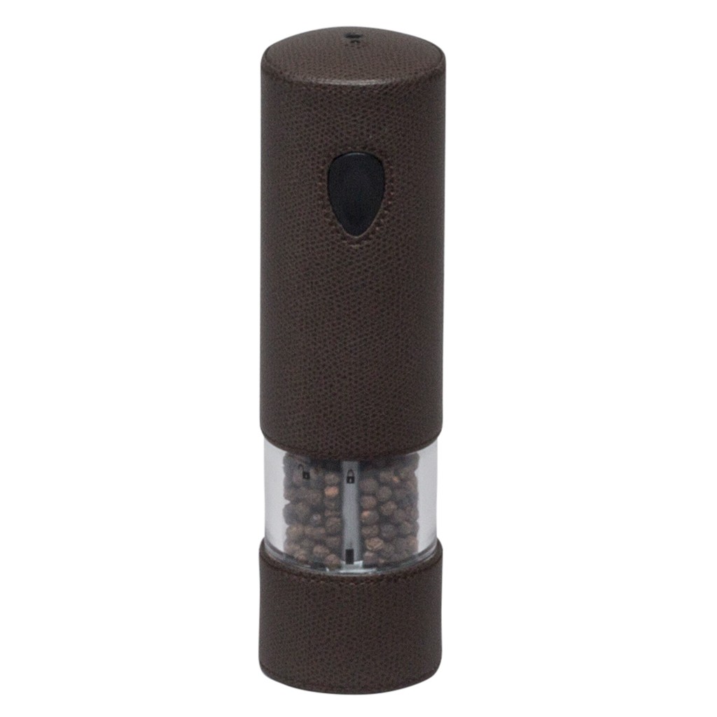 Rechargeable leather covered electric mill with stainless steel body.