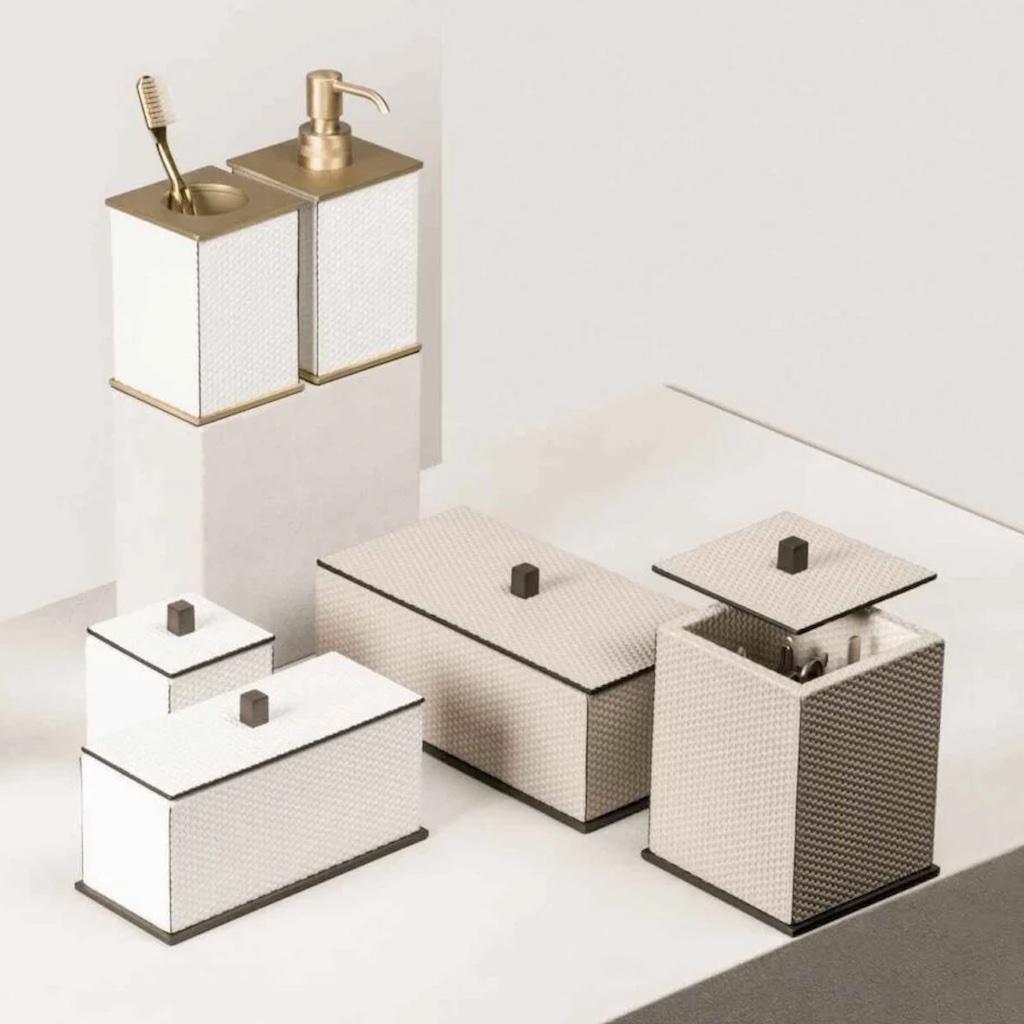 Leather covered wooden structure. Metal base frame and metal handle are available in three finishes: chrome, brass, bronze. Set equipped with the following tolls: cuticle  scissors, nail scissors, nail file. The manicure instruments are temperated stainless steel and made in Italy.
