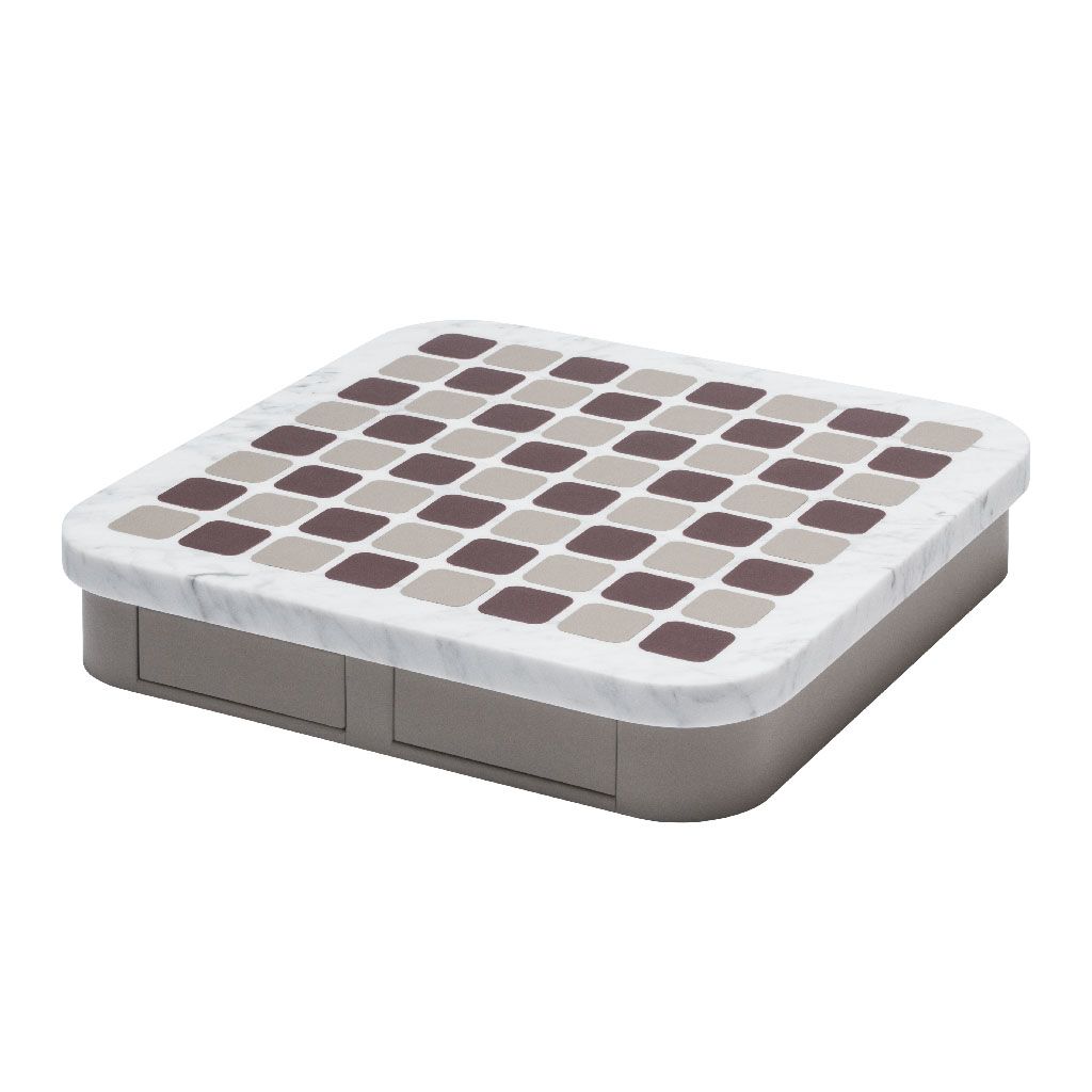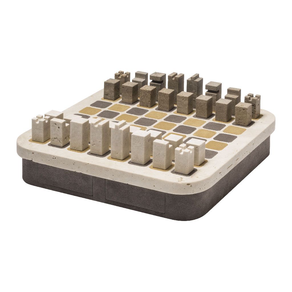 The set is equipped with marble pieces with different finishes paired together: Arabescato White + Bardiglio Grey + Travertino + Travertino Walnut