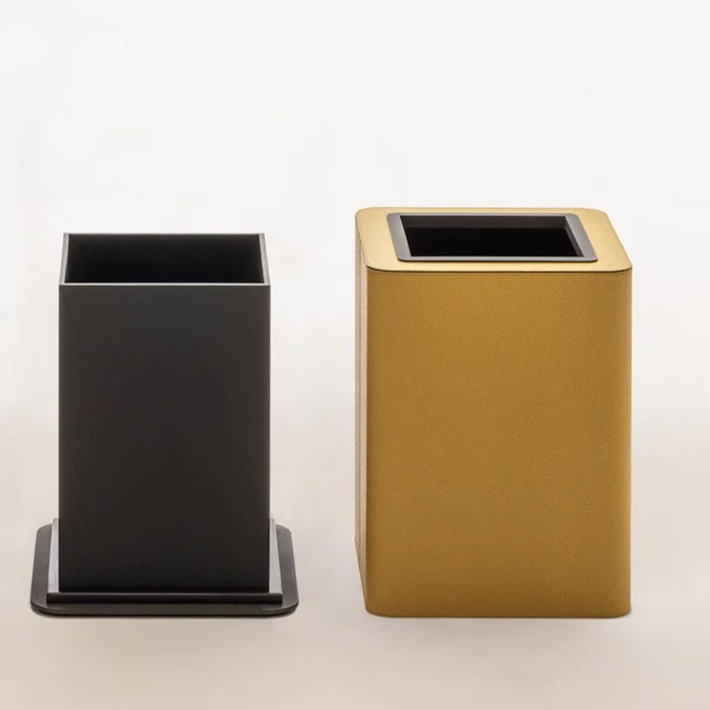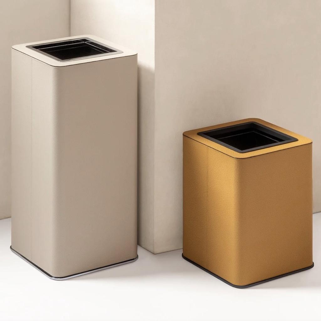 Leather-covered wood structure with metal base and top frames available in three finishes. Equipped with a non-slip waterproof rubber base underneath and a plexiglass inner structure for easy cleaning. The outer structure glides over the inner one, allowing the plastic bag to be secured and discreetly concealed.