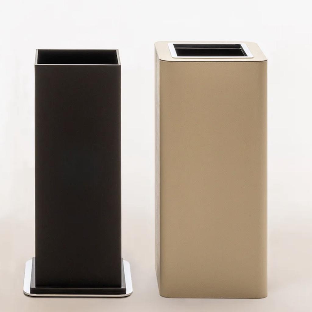 Leather-covered wood structure with metal base and top frames available in three finishes. Equipped with a non-slip waterproof rubber base underneath and a plexiglass inner structure for easy cleaning. The outer structure glides over the inner one, allowing the plastic bag to be secured and discreetly concealed.