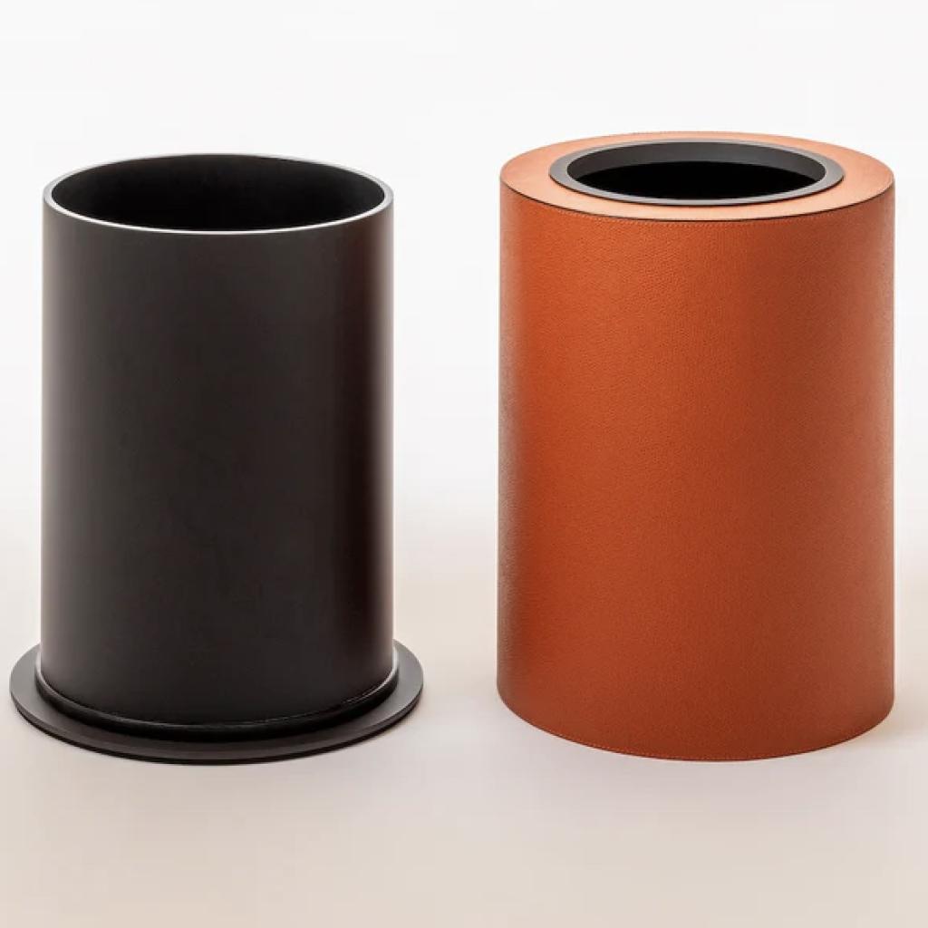 Leather-covered wood structure with metal base and top frames available in three finishes. Equipped with a non-slip waterproof rubber base underneath and a plexiglass inner structure for easy cleaning. The outer structure glides over the inner one, allowing the plastic bag to be secured and discreetly concealed.
