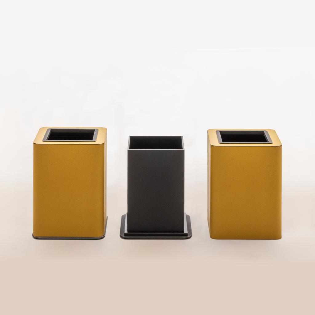 All-leather-covered wood structure equipped with a non-slip waterproof rubber base underneath and a plexiglass inner structure for easy cleaning. The outer structure glides over the inner one, allowing the plastic bag to be secured and discreetly concealed.