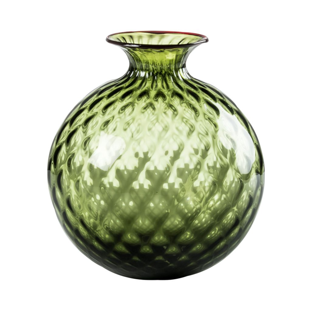 "It looks soft, but it’s not; it’s glass. The optical illusion of Monofiori by VENINI from 1970 lies in its name: Balloton, a special technique that lends a unique matelassé effect to the surface. The piece is handcrafted using traditional metal molds and adorned with a hot-applied line in contrasting colours on the top of the narrow neck, for a finishing touch that makes a difference."