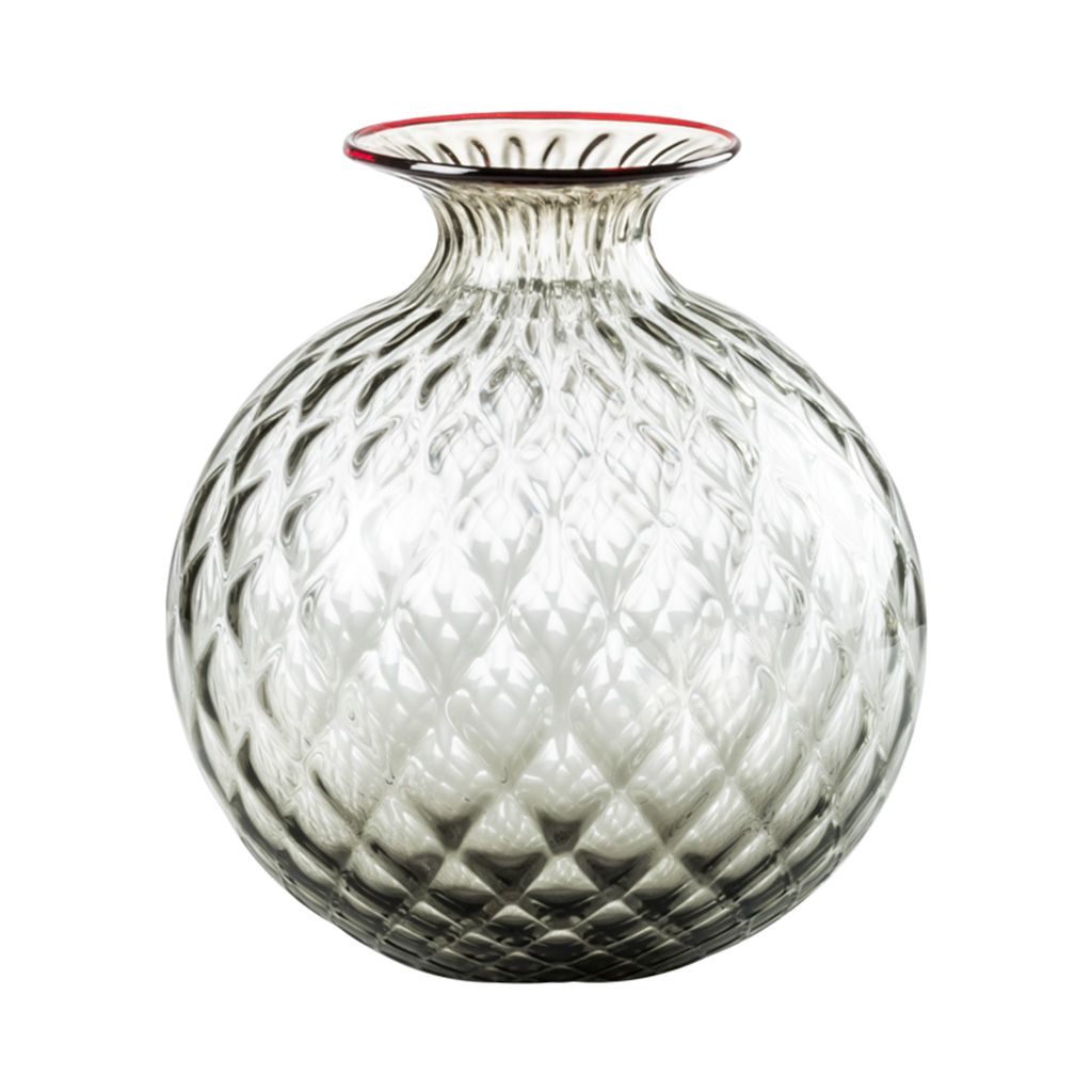 "It looks soft, but it’s not; it’s glass. The optical illusion of Monofiori by VENINI from 1970 lies in its name: Balloton, a special technique that lends a unique matelassé effect to the surface. The piece is handcrafted using traditional metal molds and adorned with a hot-applied line in contrasting colours on the top of the narrow neck, for a finishing touch that makes a difference."