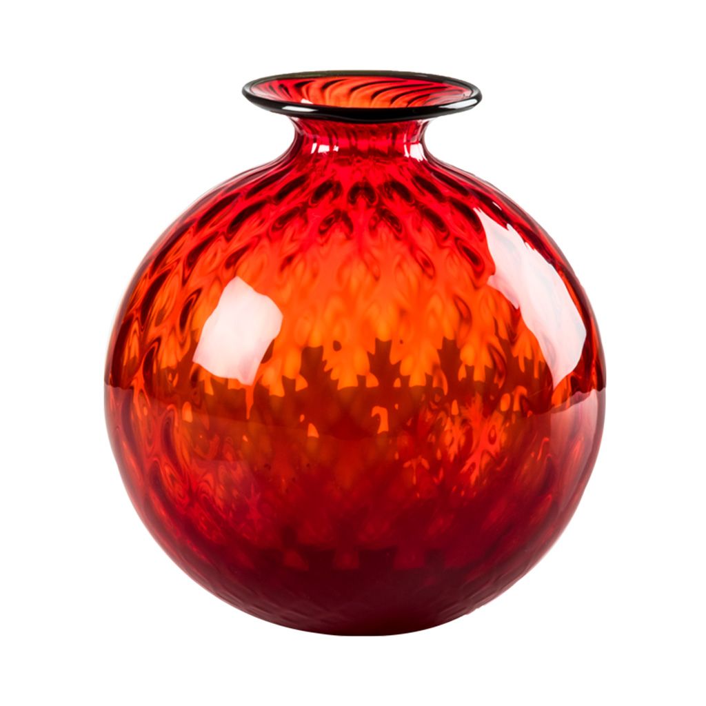 "It looks soft, but it’s not; it’s glass. The optical illusion of Monofiori by VENINI from 1970 lies in its name: Balloton, a special technique that lends a unique matelassé effect to the surface. The piece is handcrafted using traditional metal molds and adorned with a hot-applied line in contrasting colours on the top of the narrow neck, for a finishing touch that makes a difference."