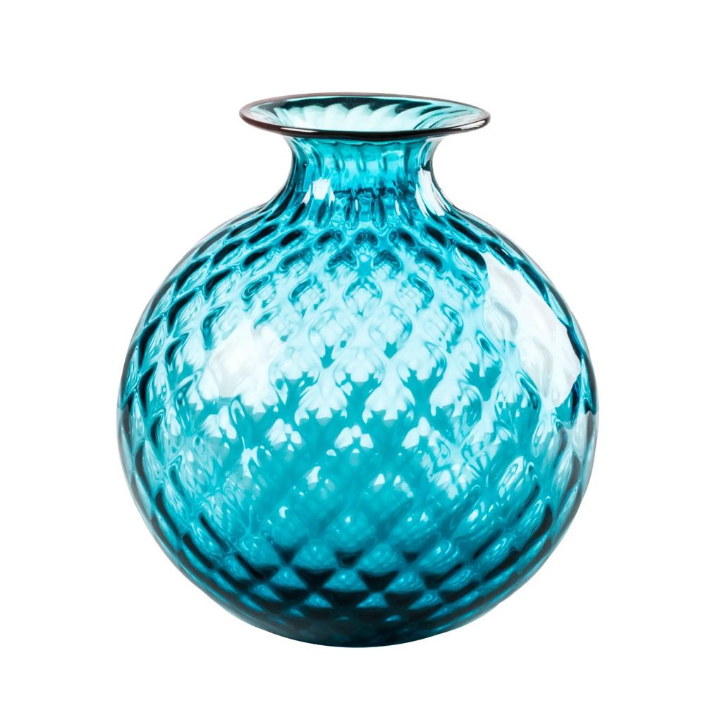 "It looks soft, but it’s not; it’s glass. The optical illusion of Monofiori by VENINI from 1970 lies in its name: Balloton, a special technique that lends a unique matelassé effect to the surface. The piece is handcrafted using traditional metal molds and adorned with a hot-applied line in contrasting colours on the top of the narrow neck, for a finishing touch that makes a difference."