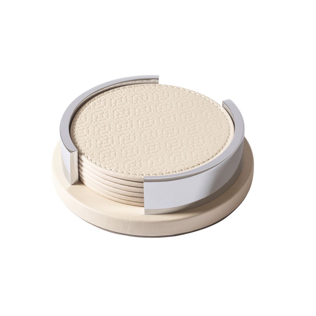 It hosts 6 round coasters featuring the ELIE SAAB Monogram pattern.