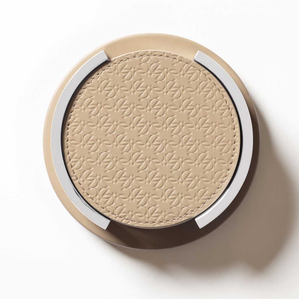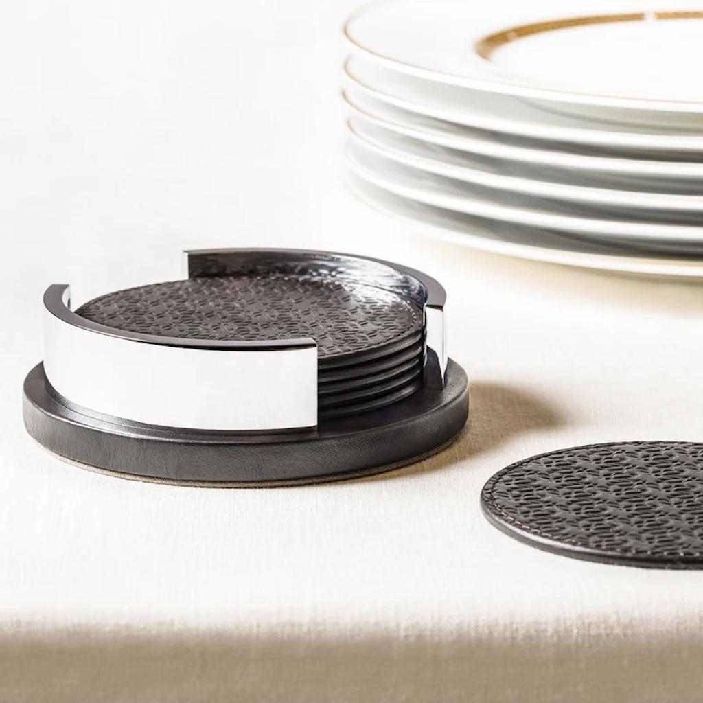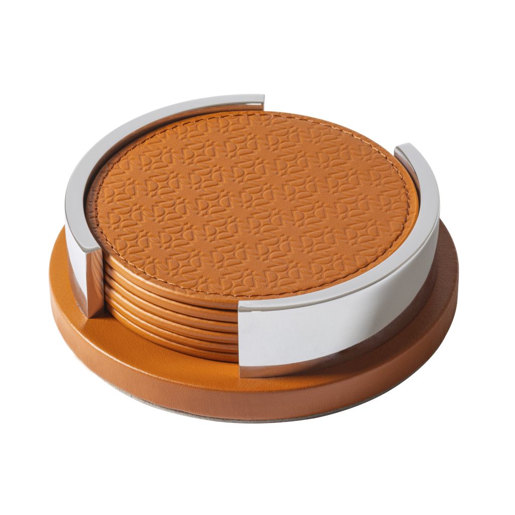 Leather coaster holder with polished palladium details.