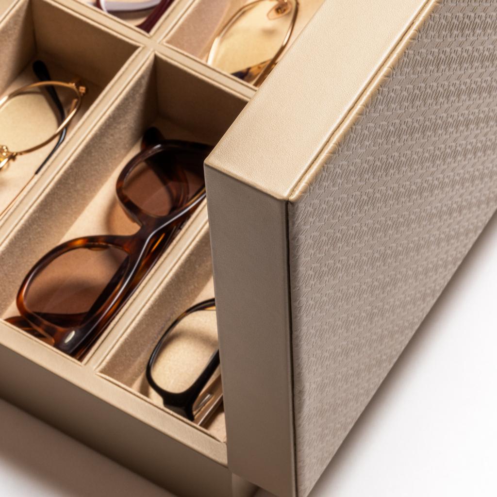 Leather glasses box with six spaces, suede lining and hinged leather lid featuring the ELIE SAAB Monogram pattern.