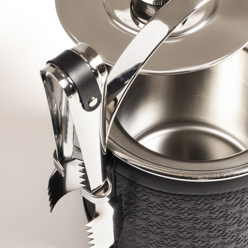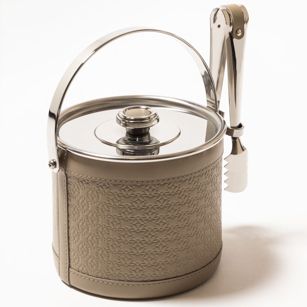 Stainless steel ice bucket covered with leather featuring the ELIE SAAB Monogram pattern ontwo sides.