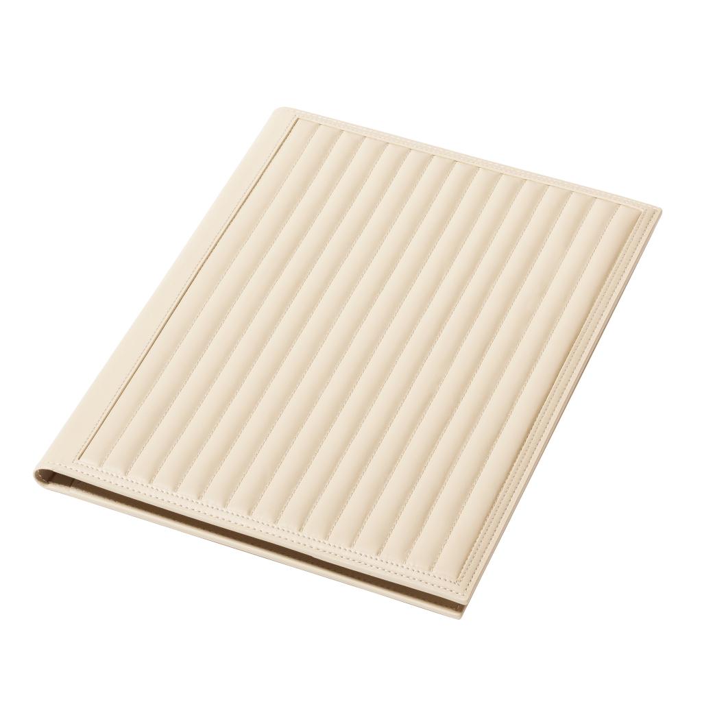 Leather notepad holder featuring a padded quilted lines pattern. Side pencil holder with pen. Includes a notepad made of 70 ivory paper sheets.