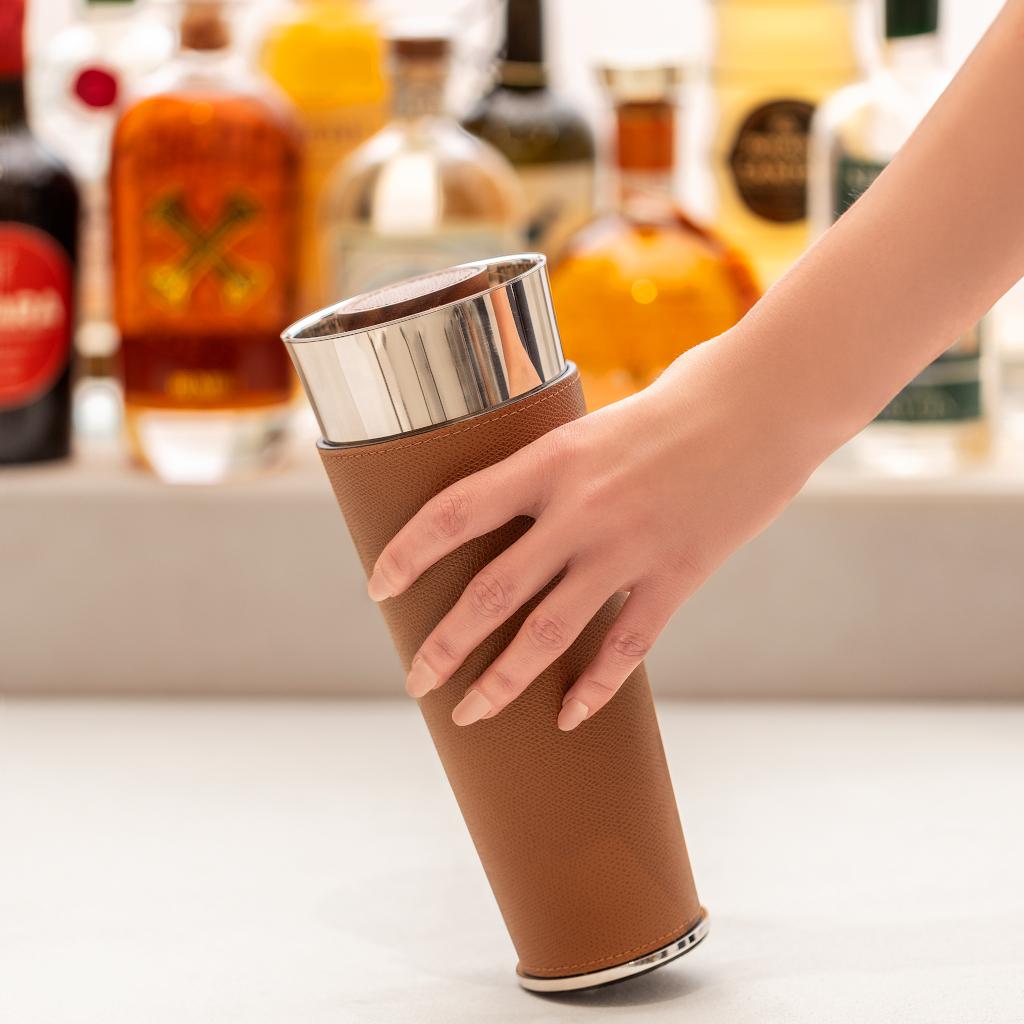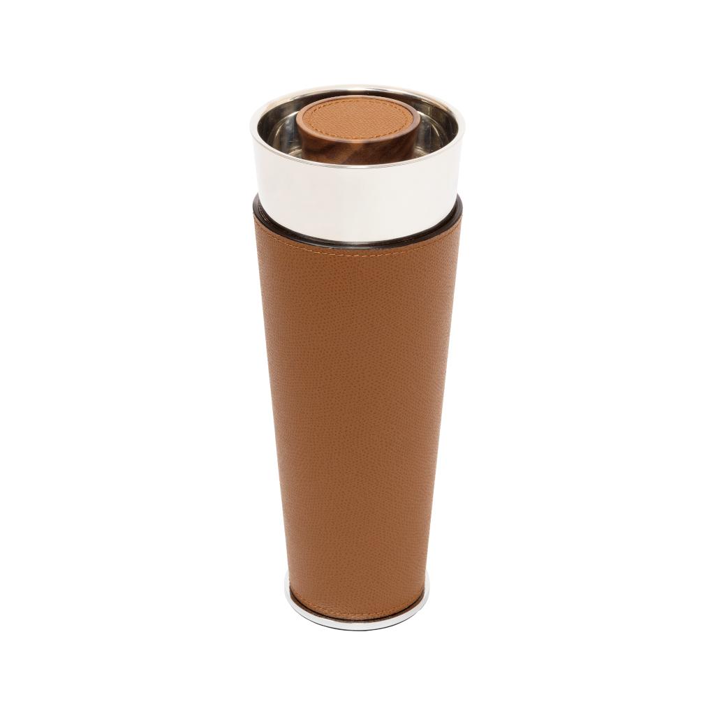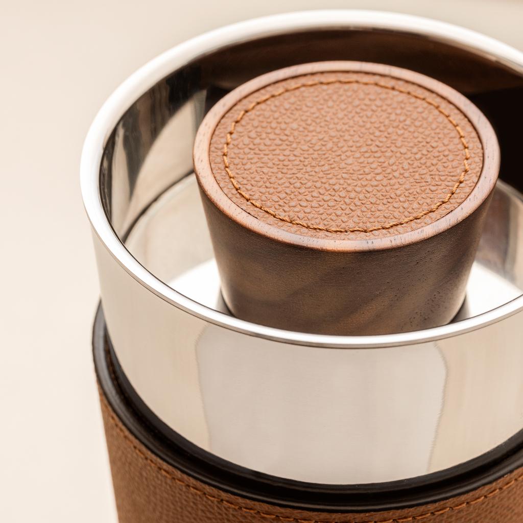 Its double-chamber polished stainless-steel body, shaped as a reversed truncated cone, offers a balanced, confident grip. A leather band runs seamlessly around the body, introducing tactile warmth and visual continuity, while the walnut wood top, finished with a leather inlay, provides a composed and crafted finish.