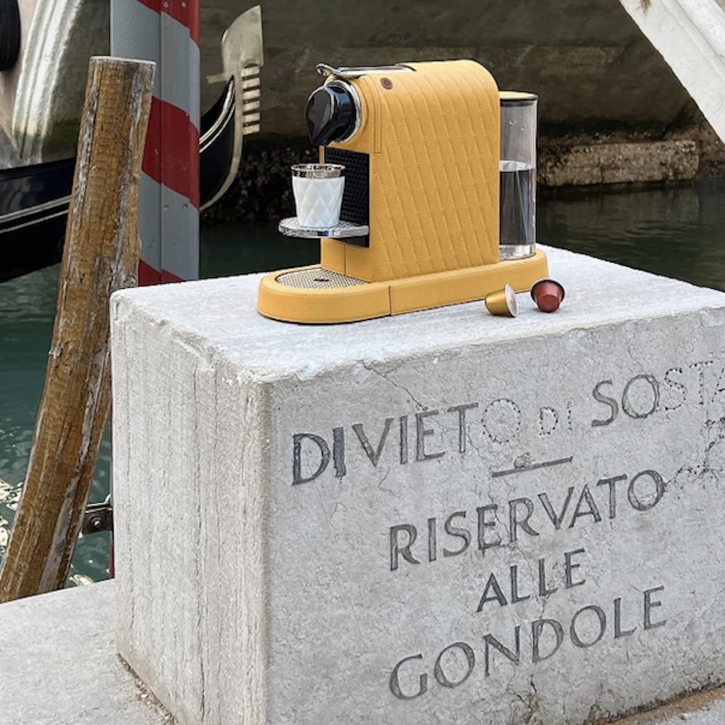 Original Nespresso machine covered in leather with a diamond or straight lines quilt pattern.