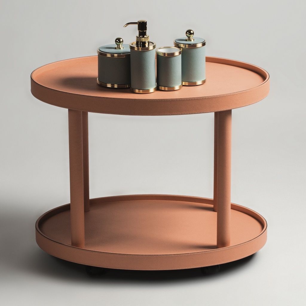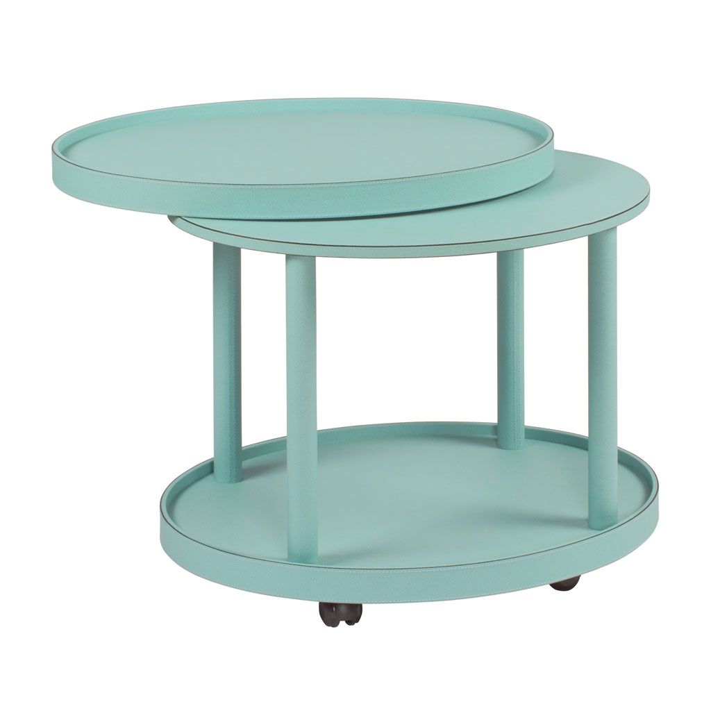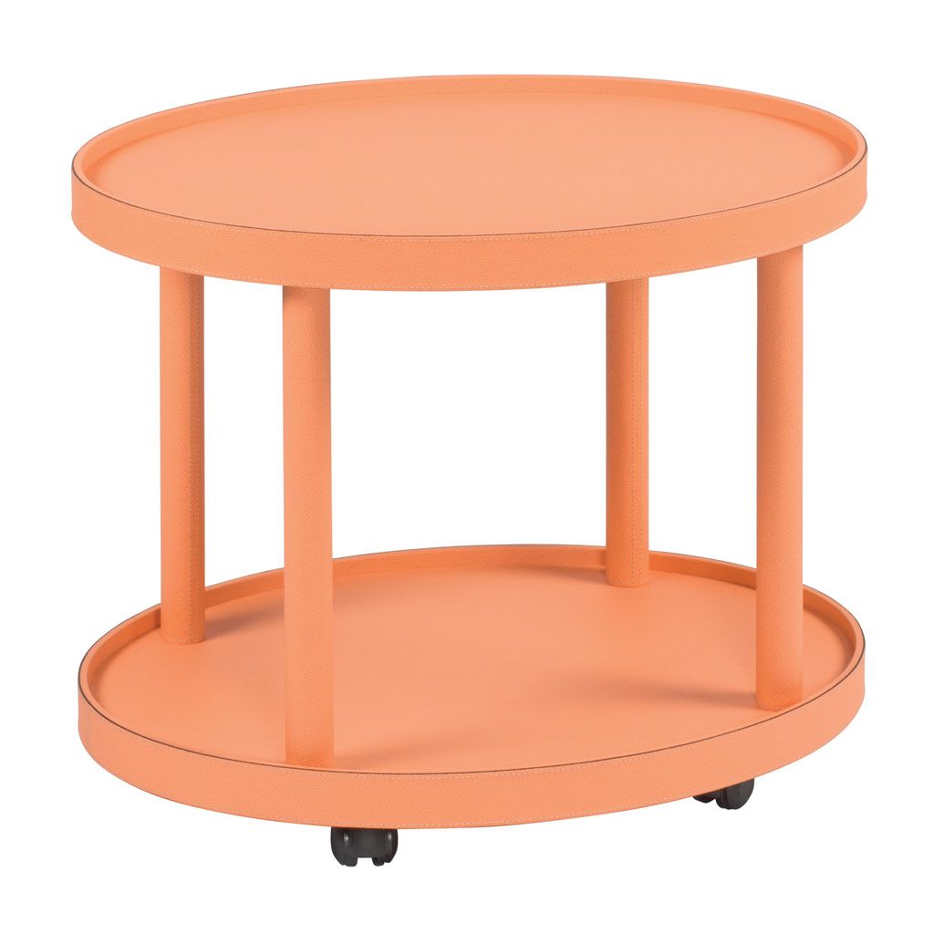 Four-wheel trolley in handcrafted wood covered in leather with removable tray.