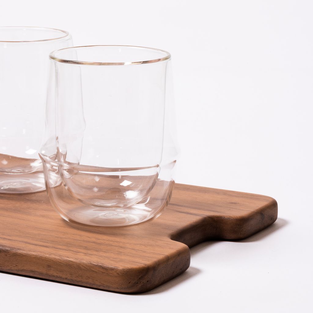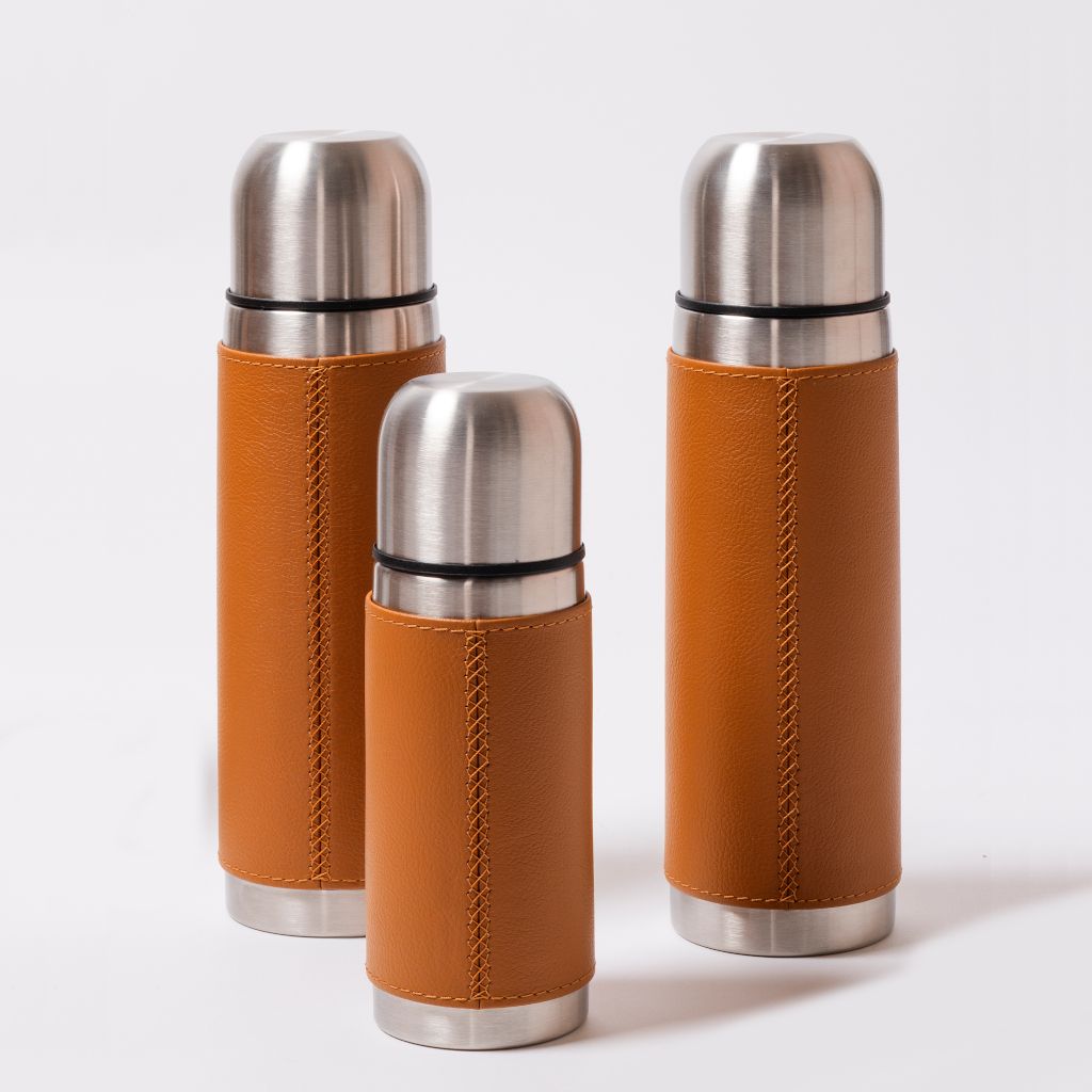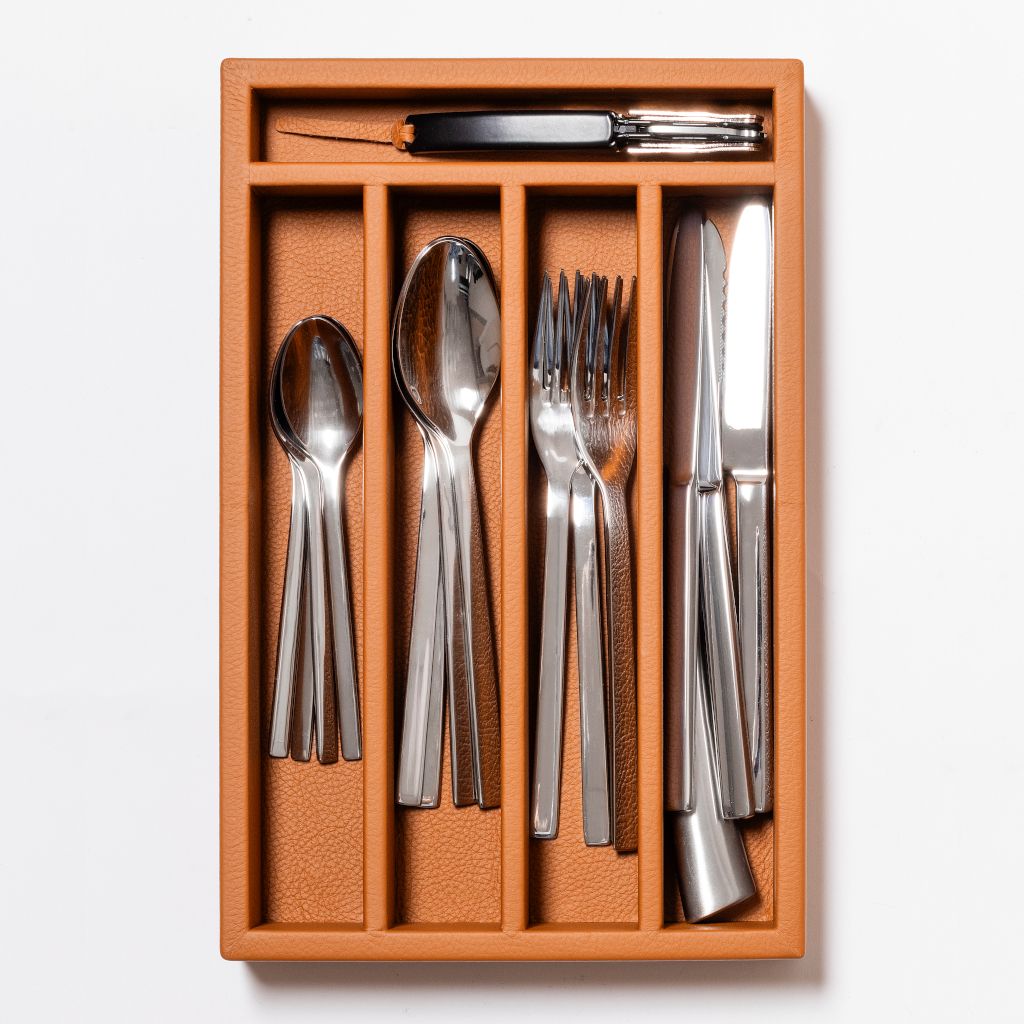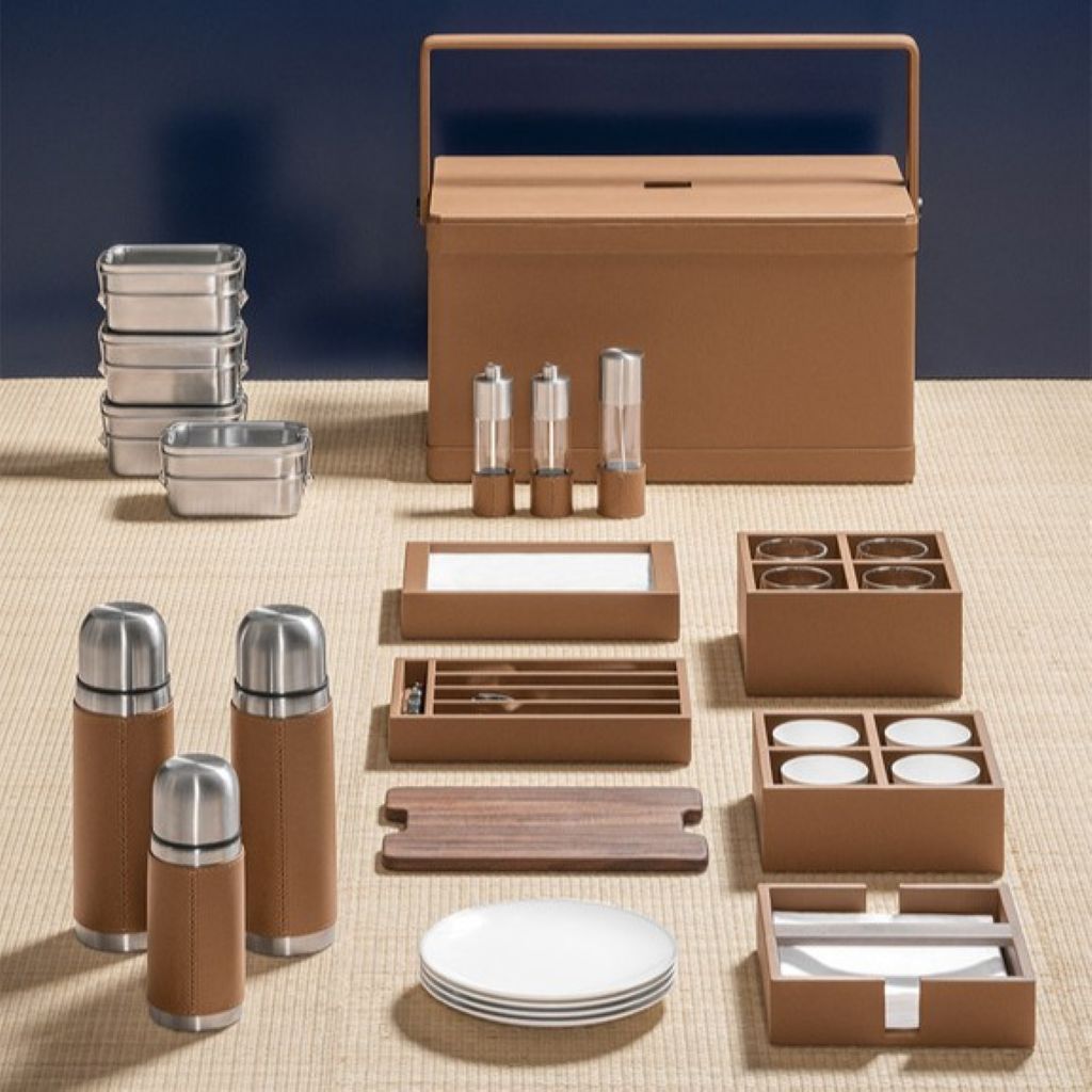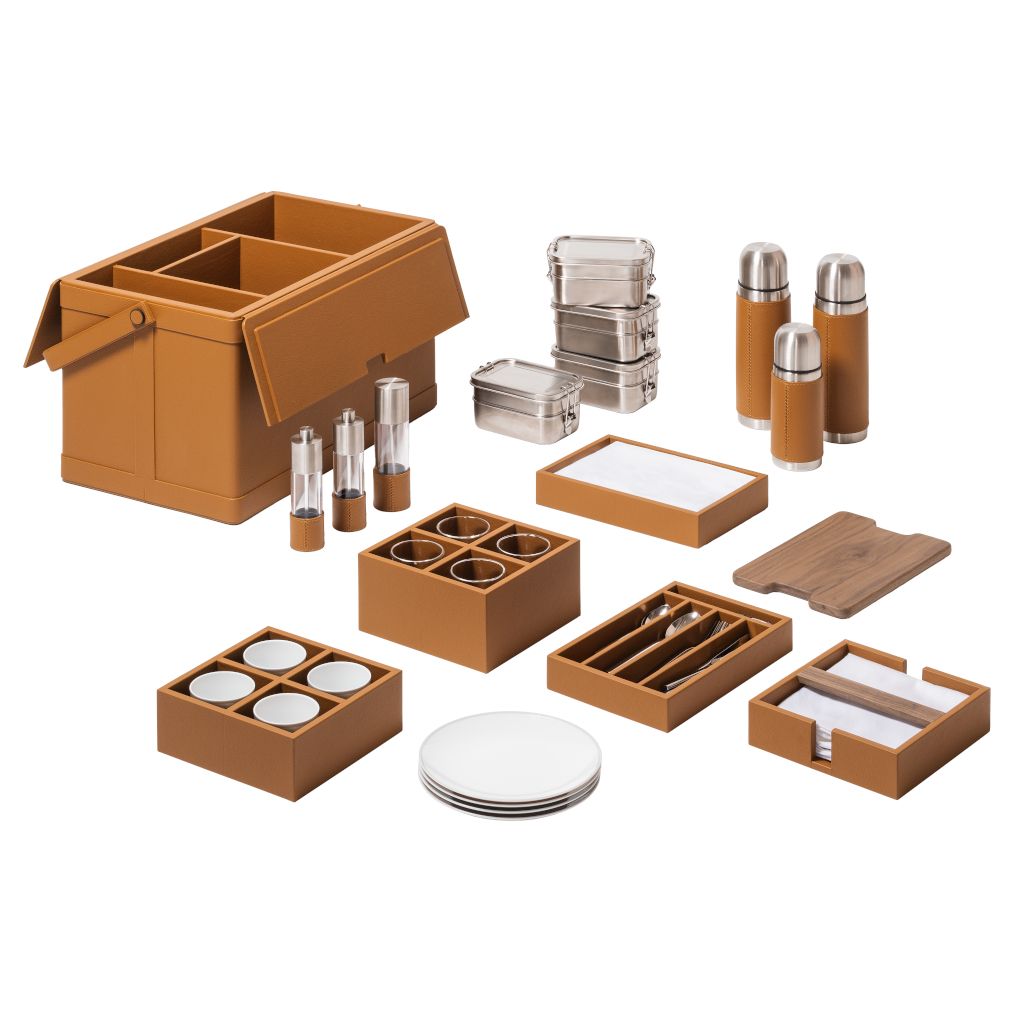 The set is equipped with: x4 double-chamber transparent borosilicate glasses, x3 leather-covered thermos (x2 1.0lt, x1 0.5lt), x1 walnut wood chopping board, x4 stainless steel food containers with 8 compartments, x1 leather-covered salt grinder, x1 leathercovered pepper grinder, x1 leather-covered oil spray dispenser, x1 stainless steel cutlery set (x4 forks, x4 knives, x4 spoons, x4 small spoons, x1 multiuse knife, x1 corkscrew & bottle opener), x4 porcelain plates & x4 porcelain cups adorned with a delicate graphic trim, x1 !ne cotton picnic blanket, x4 !ne cotton napkins.