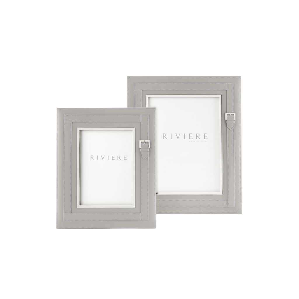 Leather frame with “belt” decoration, metal trim gold or chrome.