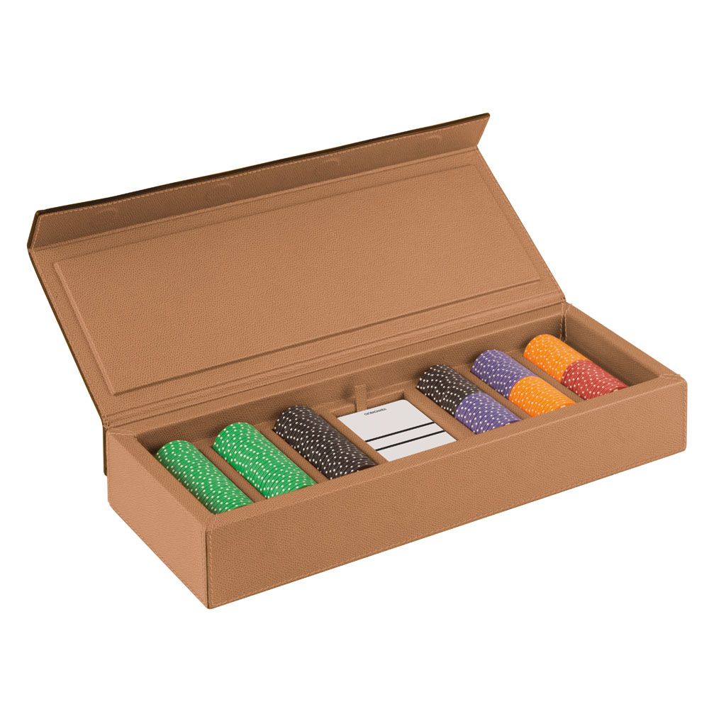 Includes a deck of playing cards and poker chips in 5 denominations.
