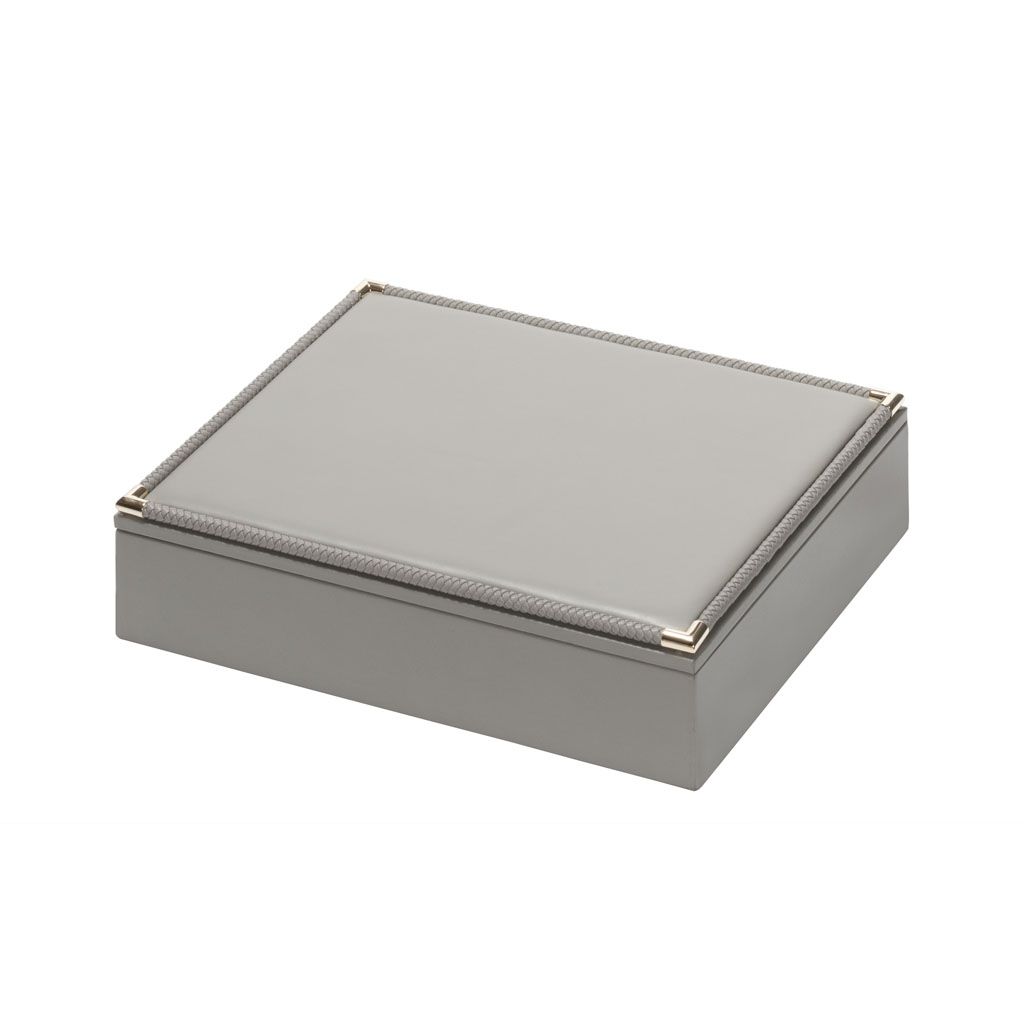Leather box with braided leather trim and chrome or gold metal details. Includes a deck of high quality playing cards and ceramic poker chips with 5 denominations.