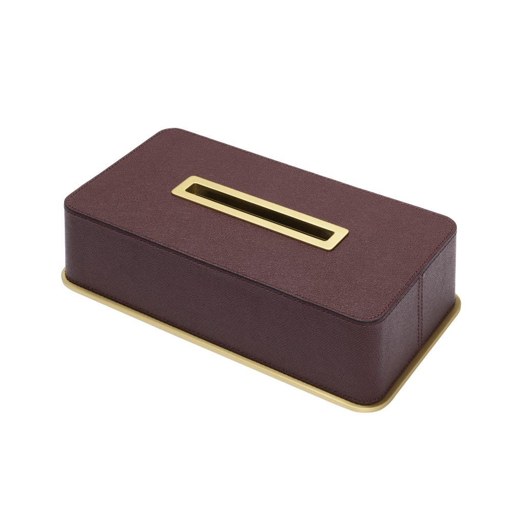 Leather-covered wood structure with metal base and top frames offered in three finishes.